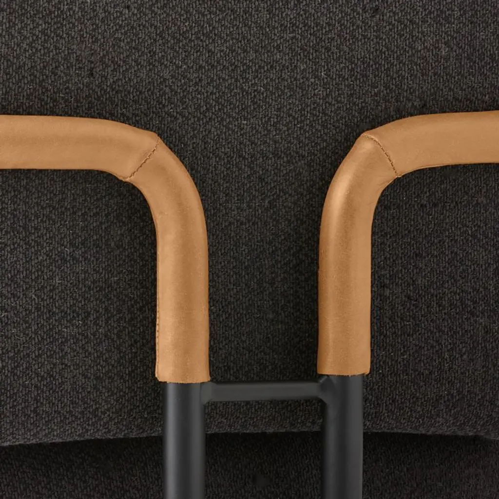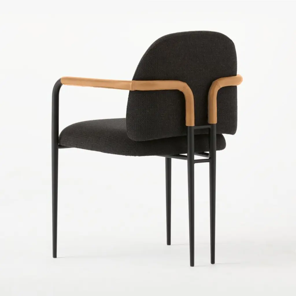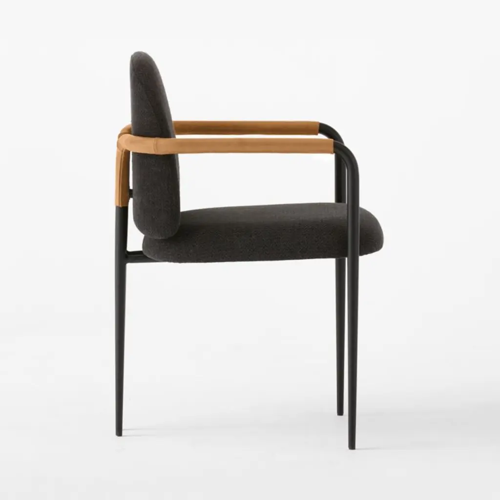 The strong, architectural silhouette of Jannis Ellenberger's dining chair recalls classic Brutalist designs, updated with warm, organic finishes. Matte black armrests are wrapped in a rich Moore & Giles leather that's tanned using olive leaves for a stunning finish. Seat and backrest are upholstered in a charcoal performance fabric that can stand up to dirt and stains. CB2 exclusive.