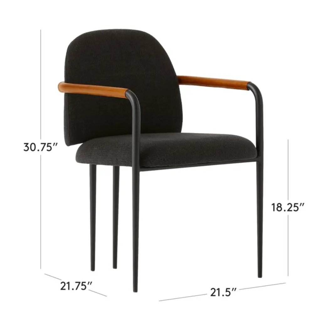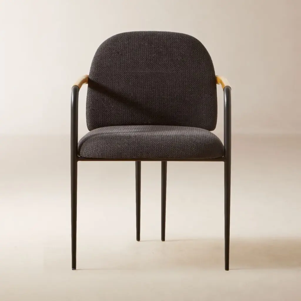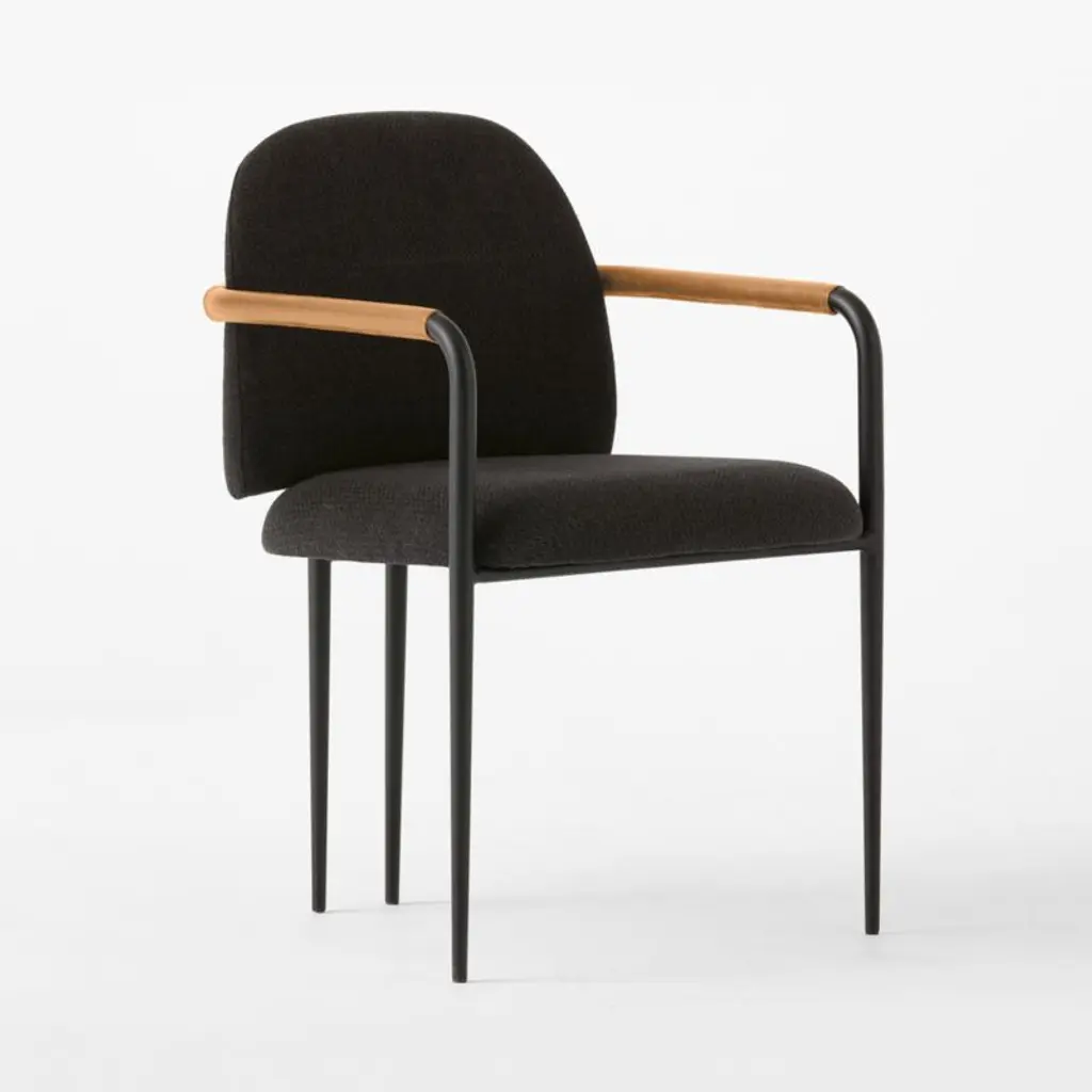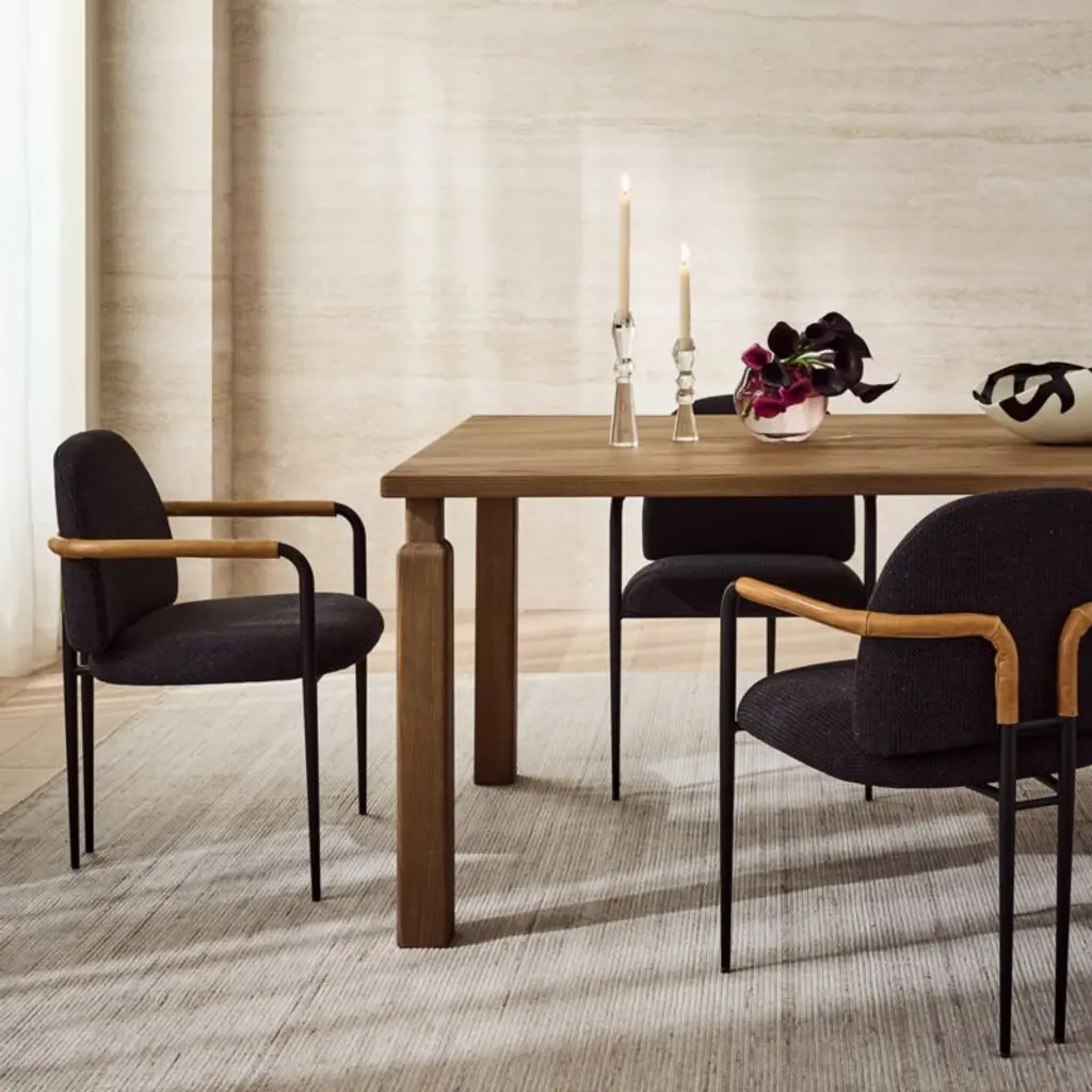 The strong, architectural silhouette of Jannis Ellenberger's dining chair recalls classic Brutalist designs, updated with warm, organic finishes. Matte black armrests are wrapped in a rich Moore & Giles leather that's tanned using olive leaves for a stunning finish. Seat and backrest are upholstered in a charcoal performance fabric that can stand up to dirt and stains. CB2 exclusive.