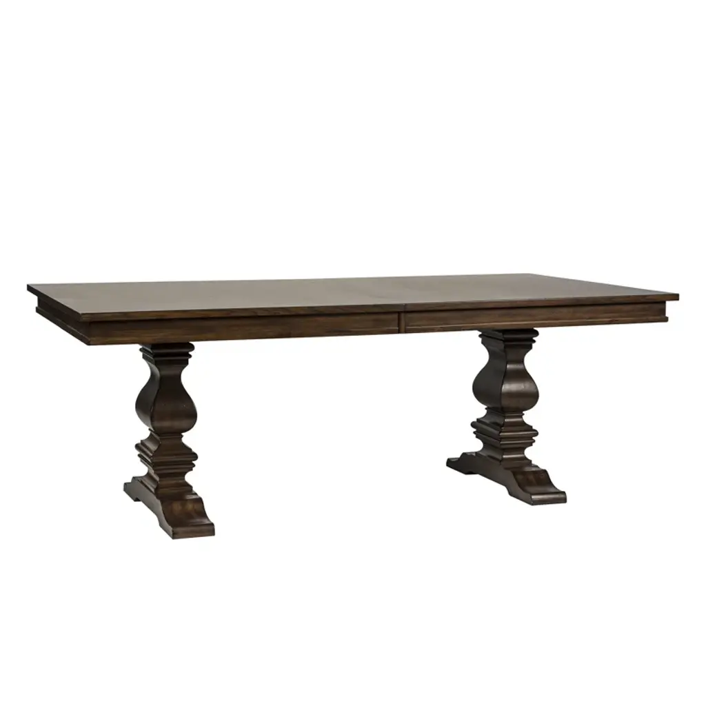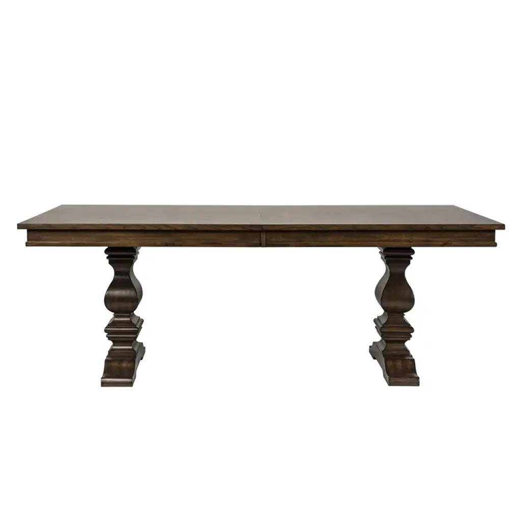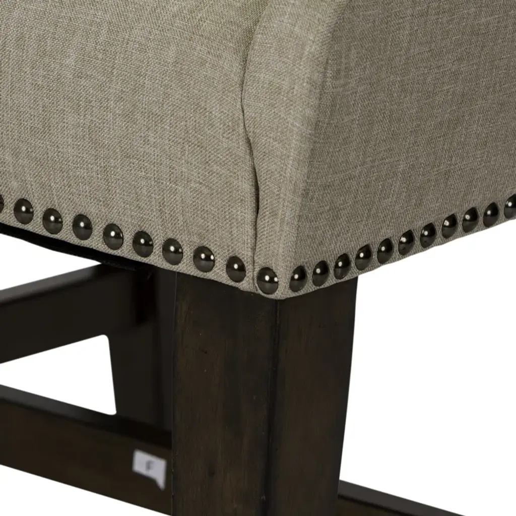 Create a grand gathering with the Barlow trestle table set. Crafted of rubberwood solids with cathedral hickory veneers, this set features an antique brownstone finish and consists of the trestle table and four or six upholstered side chairs. This trestle table features a large top at 82” long but the included 24” removable leaf makes it grand at 106”. The top is anchored by a trestle base with heavy square turned posts that are reminiscent of a 17th century French antique. Sit in comfort with the upholstered side chairs with linen upholstery and a brass nail head trip along the bottom of the seat. These chairs have an armless design with tapered legs and nylon chair glides to protect your flooring. Prepare to wow your family and friends with the Barlow trestle table set.