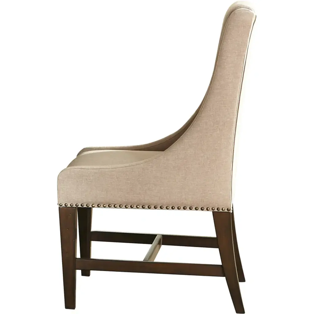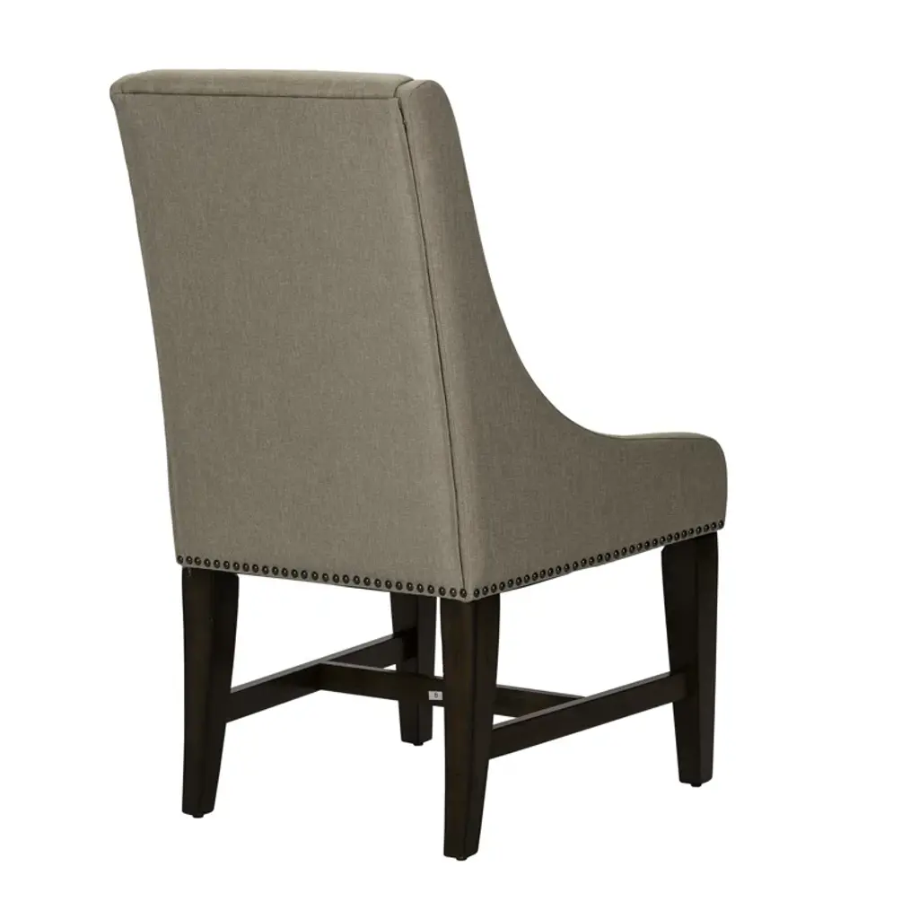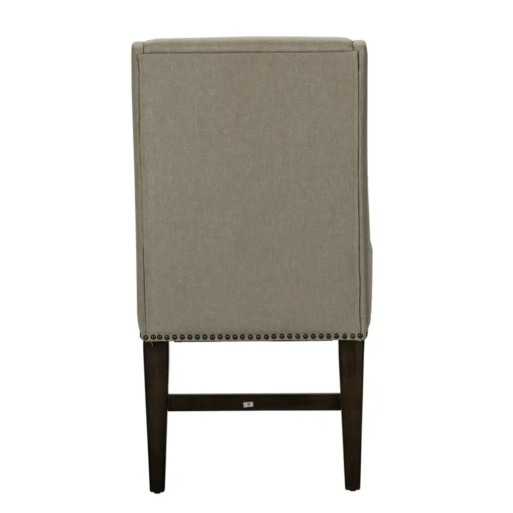 Create a grand gathering with the Barlow trestle table set. Crafted of rubberwood solids with cathedral hickory veneers, this set features an antique brownstone finish and consists of the trestle table and four or six upholstered side chairs. This trestle table features a large top at 82” long but the included 24” removable leaf makes it grand at 106”. The top is anchored by a trestle base with heavy square turned posts that are reminiscent of a 17th century French antique. Sit in comfort with the upholstered side chairs with linen upholstery and a brass nail head trip along the bottom of the seat. These chairs have an armless design with tapered legs and nylon chair glides to protect your flooring. Prepare to wow your family and friends with the Barlow trestle table set.