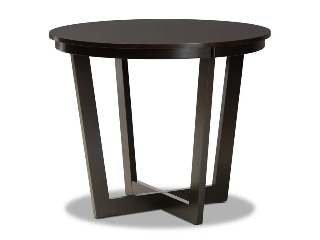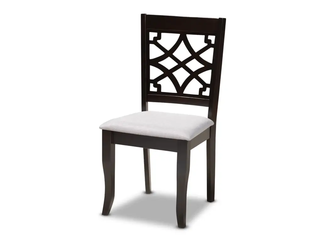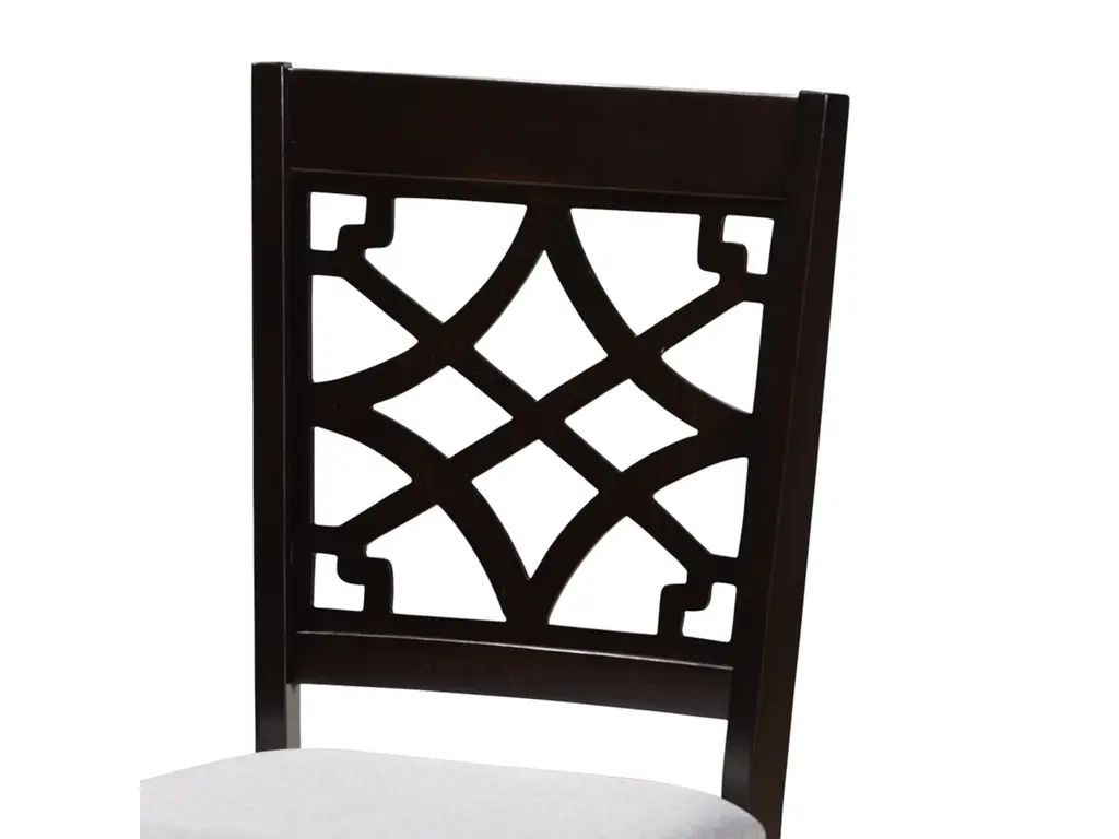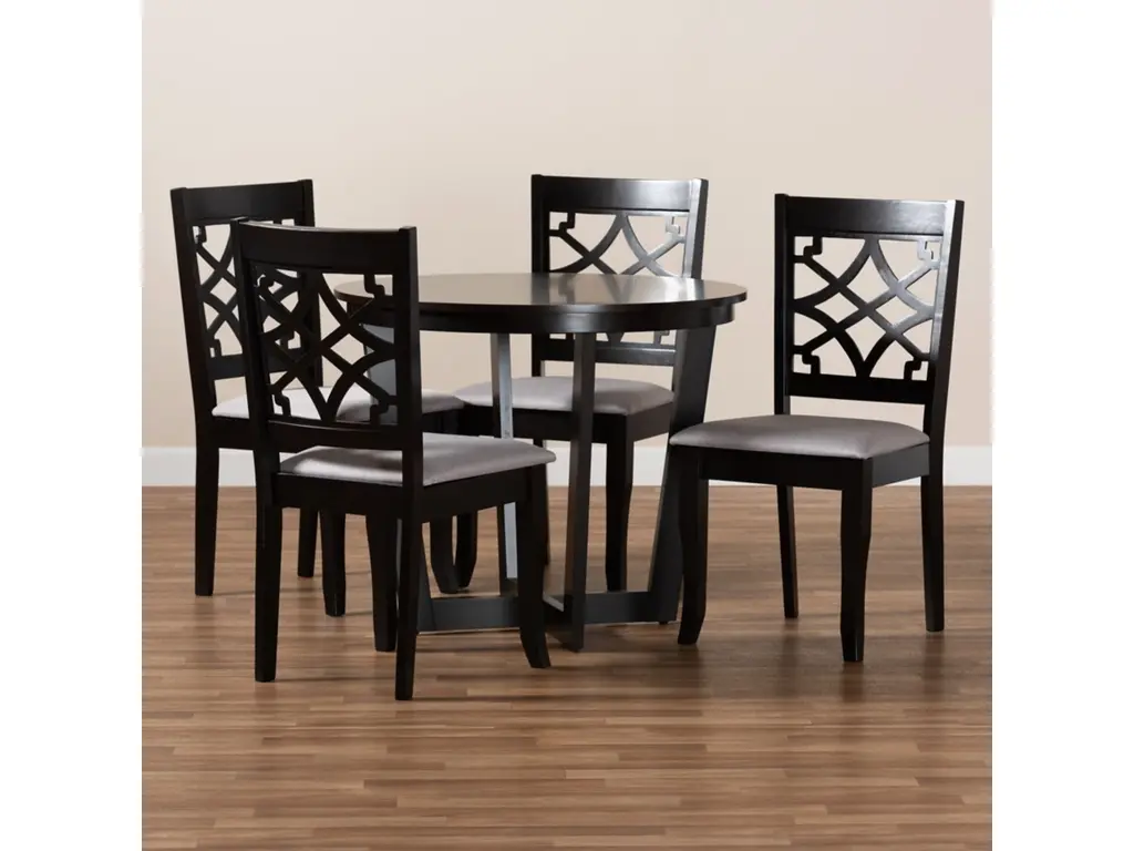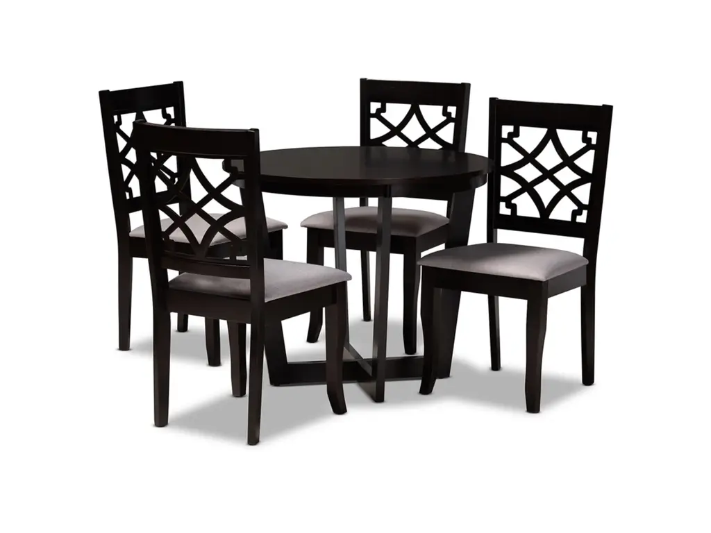 Elevate your dining space with the contemporary style of the Tricia dining set. Made in Malaysia, the Tricia includes four dining chairs and one table constructed from sturdy wood finished in a rich dark brown. Each chair is fitted with a foam padded cushion upholstered in smooth grey fabric and features a unique cut-out design on its back. Requiring assembly, the circular tabletop allows ample elbow room for each member of the table. Perfect for both casual and formal occasions, the Tricia dining set easily modernizes any home.