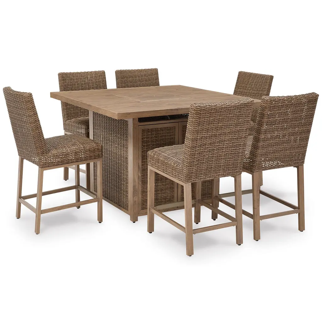 Sporting an easy-on-the-eyes look inspired by driftwood, the Beachcroft dining set elevates the art of alfresco living. Beautiful and durable enough for indoor or outdoor use, the table and chairs blend high style with low maintenance. The table charms with farmhouse styling, while its thick porcelain top adds a natural complement. The brilliantly styled chair entices with a plush, removable cushion wrapped in Nuvella® fabric that’s a breeze to keep clean.