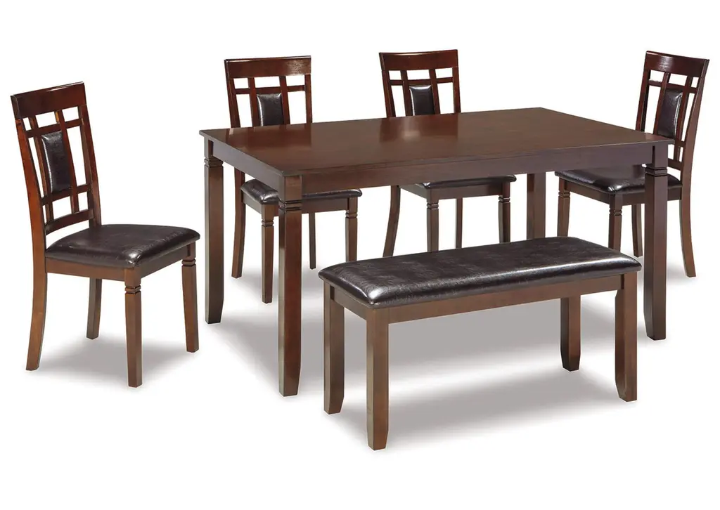 Set the scene for ultra-contemporary style with this dining room table set. Table's rich, dark finish and clean, gently tapered profile is the epitome of great taste. Cutout-design chairs with upholstered seats and back supports are a cut above. Addition of upholstered bench incorporates a generous helping of casually cool flair. - Product Details provided by Manufacturer, Slumberland not responsible for errors in information.