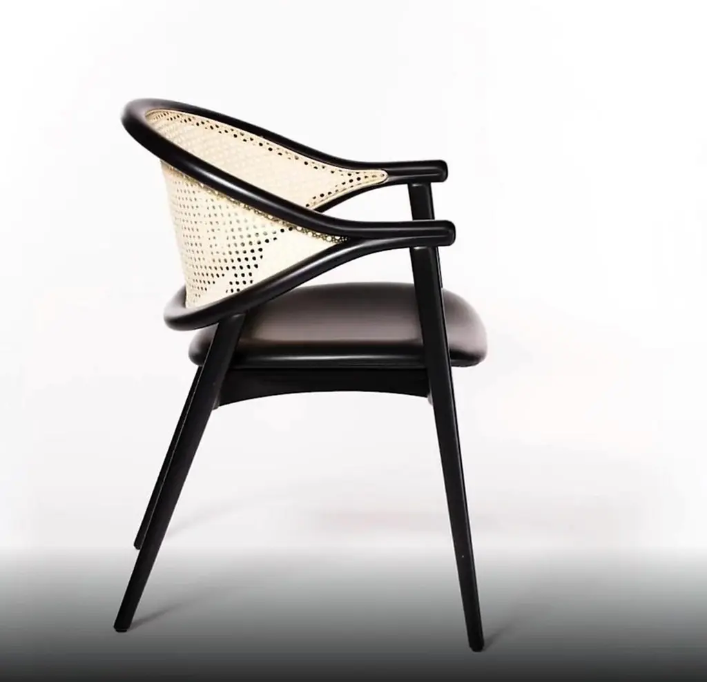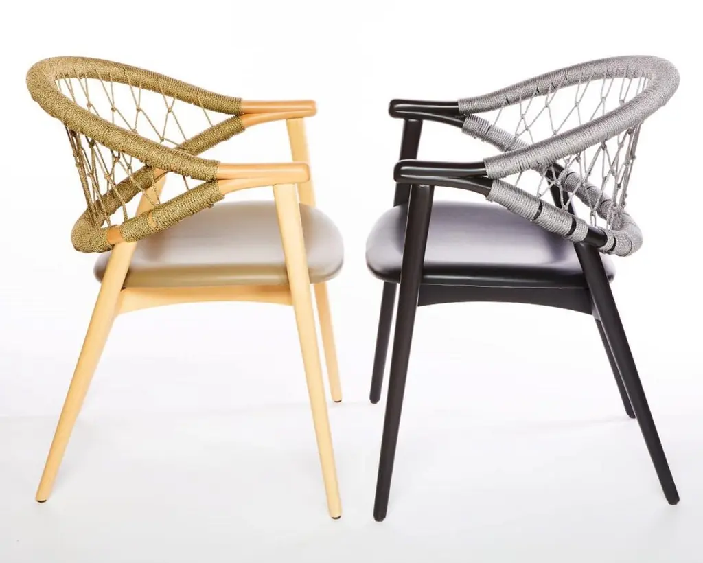 This dining chair, at first glance, appears typical, yet upon closer inspection, it reveals unique features. The backrest, crafted from two elegantly curved pieces, coupled with a svelte frame, brings a lively and dynamic aspect to its design. The chair's structure, separating the weight-bearing elements, creates an airy feel. This design approach is consistent across its variations, whether it's the cushioned model or the ones with cane or rope backrests, ensuring utmost comfort without compromising on its lightweight and aesthetically pleasing nature from every angle. Constructed from beech wood, the chair offers customization options including a range of upholstery in fabric or leather, cane, rope, and various wood finishes. Moreover, this chair is of contract grade quality, making it exceptionally sturdy and durable, surpassing the resilience of standard chairs.Measures: Height: 830 mm Width: 590 mmDepth: 600 mm Seat height: 480 mmArm Height: 700mm Structure: Beech wood100% Italian handmade product. Contact us to enquire about COM/COL production, requirements and material shipping instructions.Please contact us if you have any questions about customization and pricing. We will be glad to check with the factory’s technical team if sizes, finishes, and colors can be customized. We do our best to expedite production and to ship and deliver product within the listed lead time, however current lead times might be longer due to global shipping backlog and delays. These delays are out of our control and cannot be a reason to cancel an order.