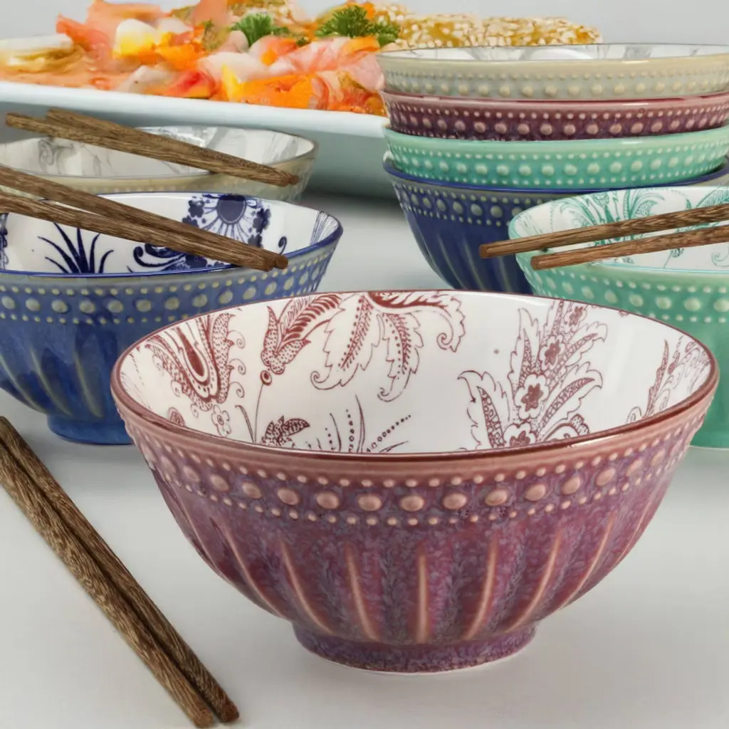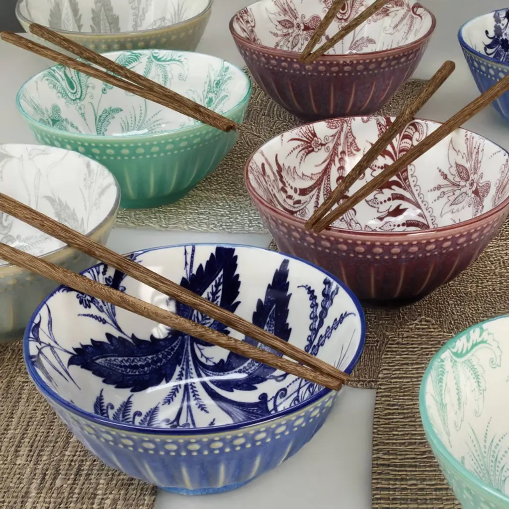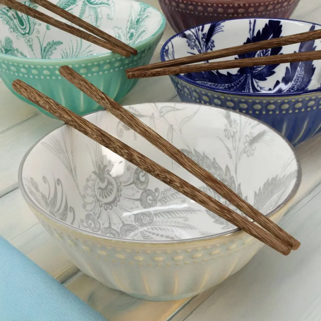 The BIA Cordon Bleu Stoneware Set of 8 Ooh La La Sonata Bowls in Assorted Colors is a charming addition to any kitchen. With a simple shape and contemporary unique designs, these individual sized bowls are perfect for serving everything from soups to desserts. Each bowl measures 6"in diameter with a 24 oz. capacity, making them ideal for everyday use or special occasions. Eight sets of Jichimu wood chopsticks are included for you to enjoy your favorite noodle dishes. Jichimu wood has deep brown and gray patterns which resemble the patterns of bird feathers. Mix and match the assorted colors to create a vibrant table setting that is sure to impress your guests. These bowls are also oven, microwave, and dishwasher safe for convenience. BIA Cordon Bleu: Designed With Modern Sensibility For Wherever You Live, However You Cook, And Whenever You Entertain.