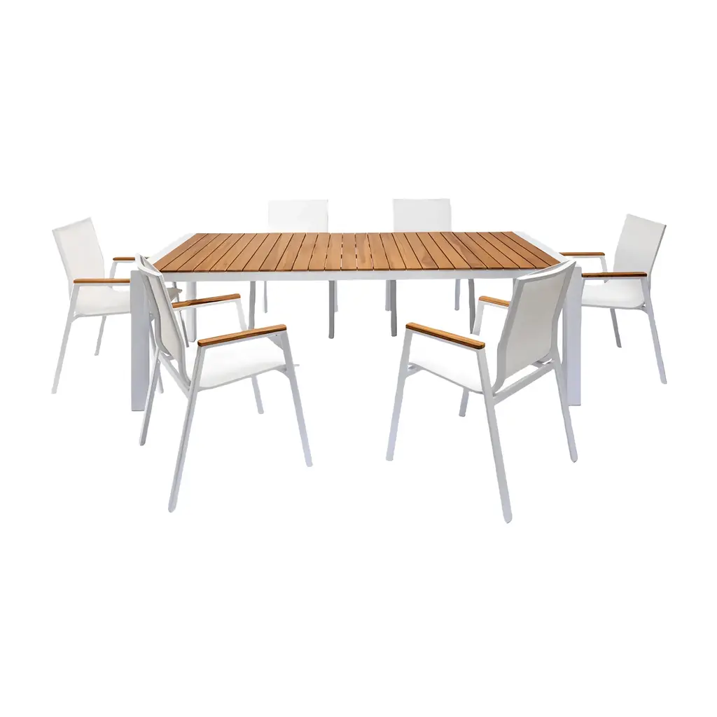The Bliss dining set offers a sleek, minimalist aesthetic that fits naturally into a variety of outdoor spaces. Made from powder-coated aluminium, Bliss is lightweight, easy to reposition and built to withstand the demands of outdoor use throughout the year, which makes it perfect for patios, garden spaces, and inviting outdoor areas in dining venues. The design provides a spacious, modern look, and the rectangular table creates an inviting base for gatherings, dining and conversations. Use the optional Extension Leaf to extend the table and customize the dining set extra seating. Available in a selection of timeless colors, the Bliss dining set brings both sophistication and versatility, easily complementing any outdoor decor. Bliss is designed by Foersom & Hiort-Lorenzen MDD. Dining Set Includes: [1] Rectangular Dining table [4] Side Chairs