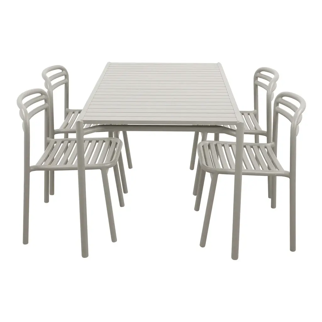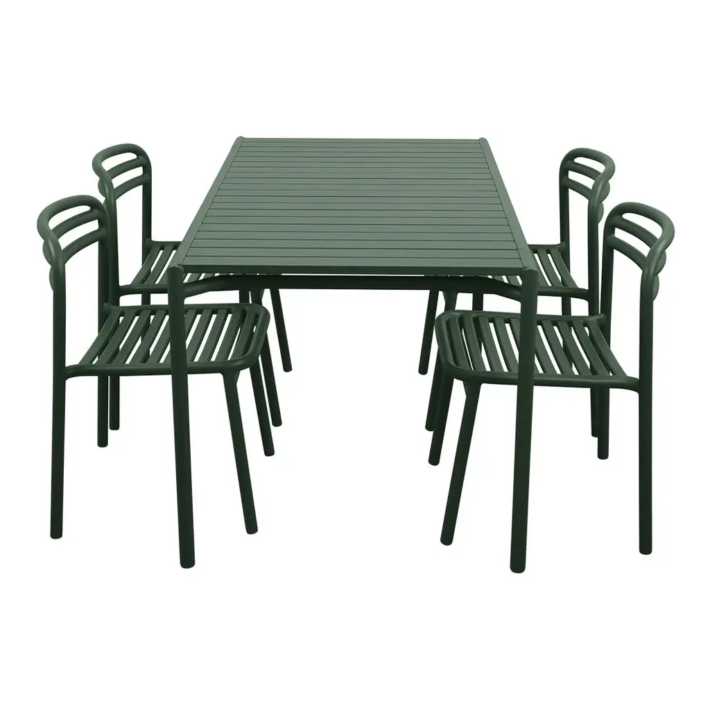 The Bliss dining set offers a sleek, minimalist aesthetic that fits naturally into a variety of outdoor spaces. Made from powder-coated aluminium, Bliss is lightweight, easy to reposition and built to withstand the demands of outdoor use throughout the year, which makes it perfect for patios, garden spaces, and inviting outdoor areas in dining venues. The design provides a spacious, modern look, and the rectangular table creates an inviting base for gatherings, dining and conversations. Use the optional Extension Leaf to extend the table and customize the dining set extra seating. Available in a selection of timeless colors, the Bliss dining set brings both sophistication and versatility, easily complementing any outdoor décor. Bliss is designed by Foersom & Hiort-Lorenzen MDD.Dining Set Includes: [1] Rectangular Dining table [4] Side Chairs