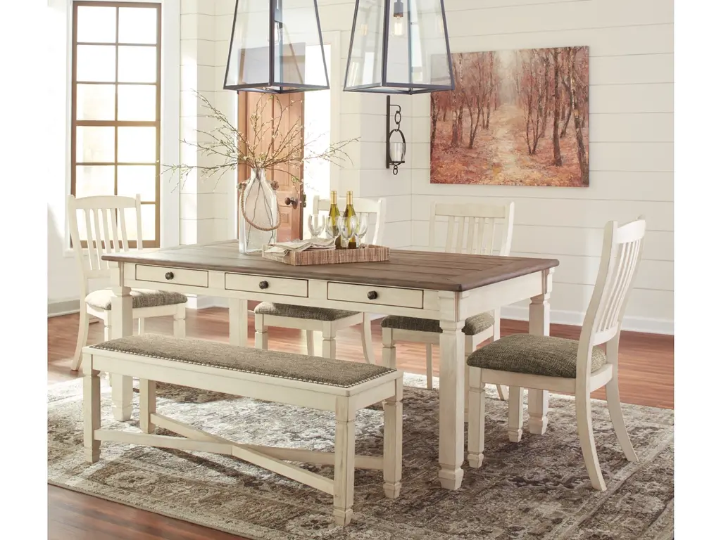 Enjoy beautiful cottage style with the classic Bolanburg dining table set. With a rustic planked top, this table serves up casual with a vintage twist. The gently distressed tabletop, paired with the rake-back design of the chairs and upholstered benches in a textured antique white finish, is a perfect set for impromptu gatherings. With six built-in drawers, you can keep placemats, napkins and utensils on hand for maximum practicality in any living space. For a quaint ensemble you're bound to love, choose this Bolanburg set.