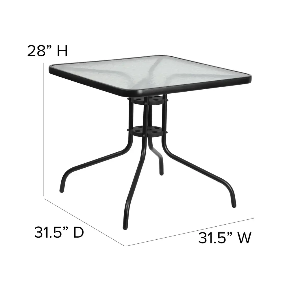 Entertaining outdoors can be relaxed or elegant depending on your occasion so don't put off furnishing the outdoor space at your home or business any longer. This 5 piece patio table set for 4 boasts a square outdoor glass table with a designer rippled look, but is smooth to the touch to keep items level. Ergonomic sling design patio chairs with curved arms not only look great, they feature breathable, flex comfort material to keep you cool during the hot summer days. Serve meals outside for a change of pace with no worries. This outdoor patio table boasts a solid steel, powder coated frame that will hold up to 130 Lbs. weight capacity and the outdoor patio chairs will hold up to 350 pounds to accommodate most users. The weather-resistant frames are designed to be enjoyed no matter the season. For longevity, care should be taken to protect from long periods of wet weather. Lightweight and stackable, the commercial grade patio chairs can be stacked up to 4 chairs high to store or clean your outdoor dining space. Arrange your perfect outdoor setting on the patio or balcony with this modern outdoor patio dining set that's meant to be enjoyed year-round.