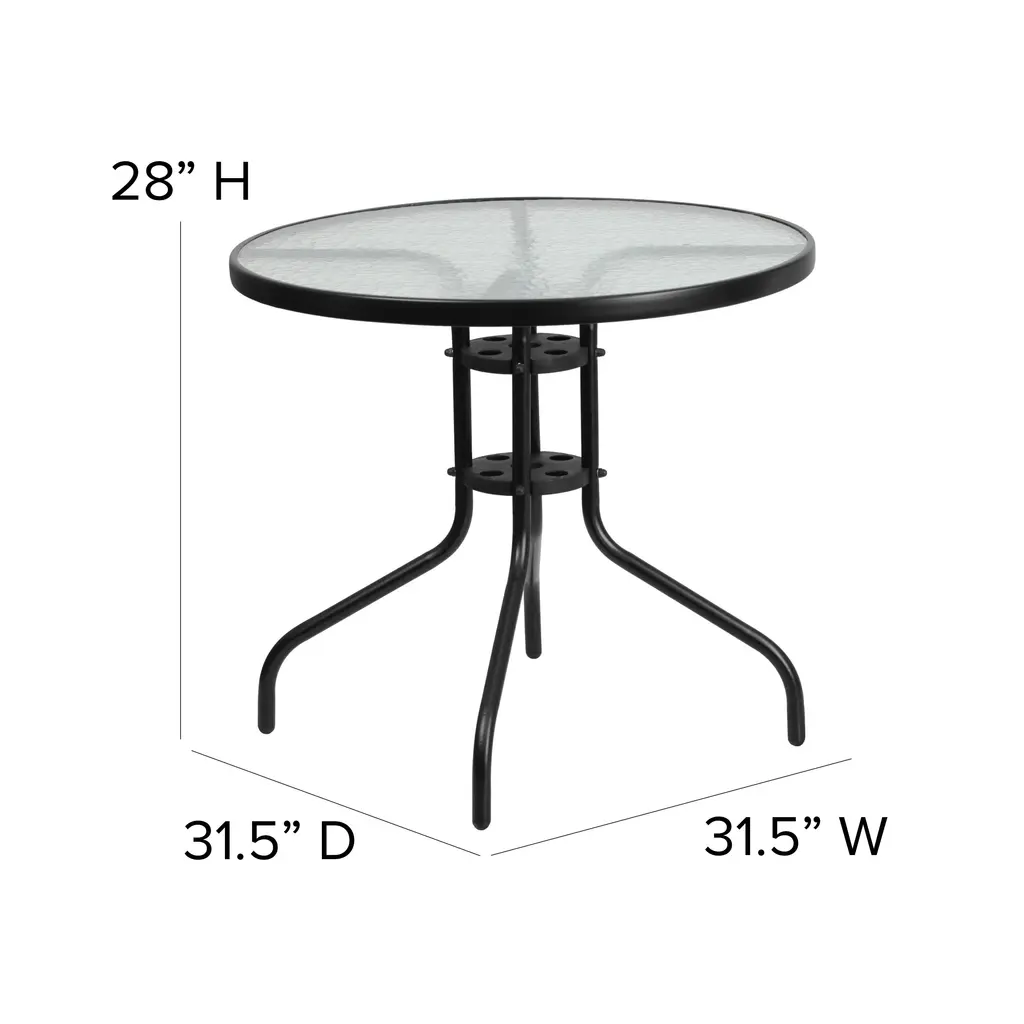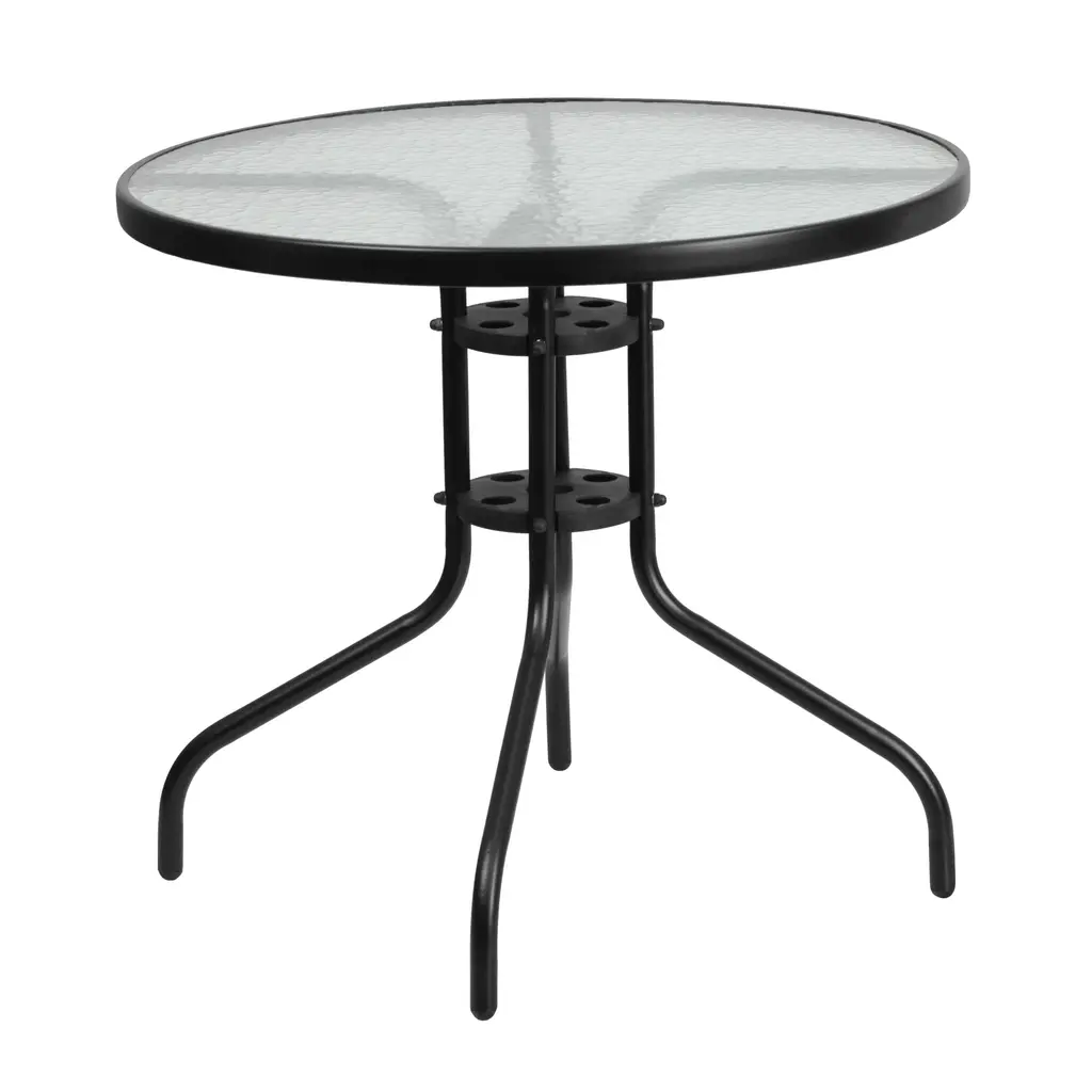 Entertaining outdoors can be relaxed or elegant depending on your occasion so don't put off furnishing the outdoor space at your home or business any longer. This 5 piece patio table set for 4 boasts a round outdoor glass table with a designer rippled look, but is smooth to the touch to keep items level. A round patio table is the perfect configuration for easy conversations between guests. Ergonomic sling design patio chairs with curved arms not only look great, they feature breathable, flex comfort material to keep you cool during the hot summer days. Serve meals outside for a change of pace with no worries. This outdoor patio table boasts a solid steel, powder coated frame that will hold up to 130 Lbs. weight capacity and the outdoor patio chairs will hold up to 350 pounds to accommodate most users. The weather-resistant frames are designed to be enjoyed no matter the season. For longevity, care should be taken to protect from long periods of wet weather. Lightweight and stackable, the commercial grade patio chairs can be stacked up to 4 chairs high to store or clean your outdoor dining space. Arrange your perfect outdoor setting on the patio or balcony with this modern outdoor patio dining set that's meant to be enjoyed year-round.