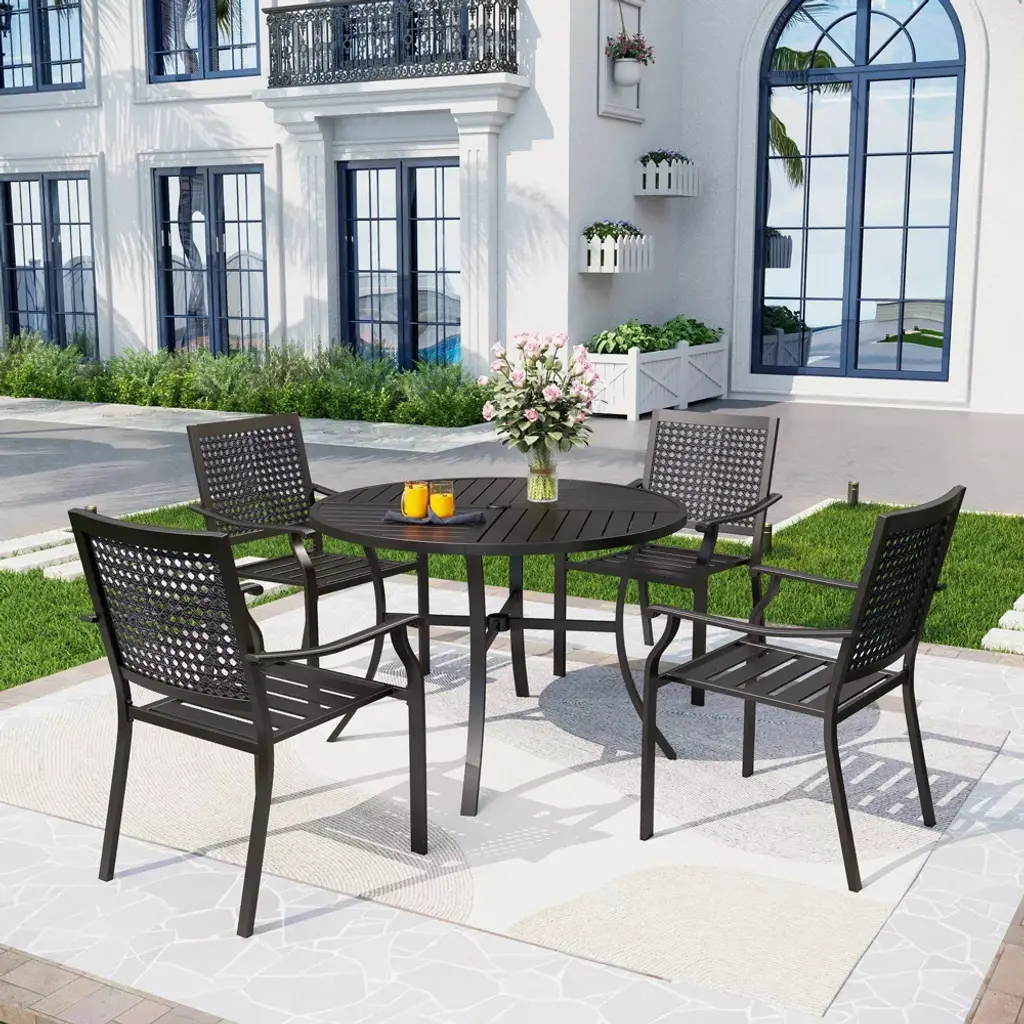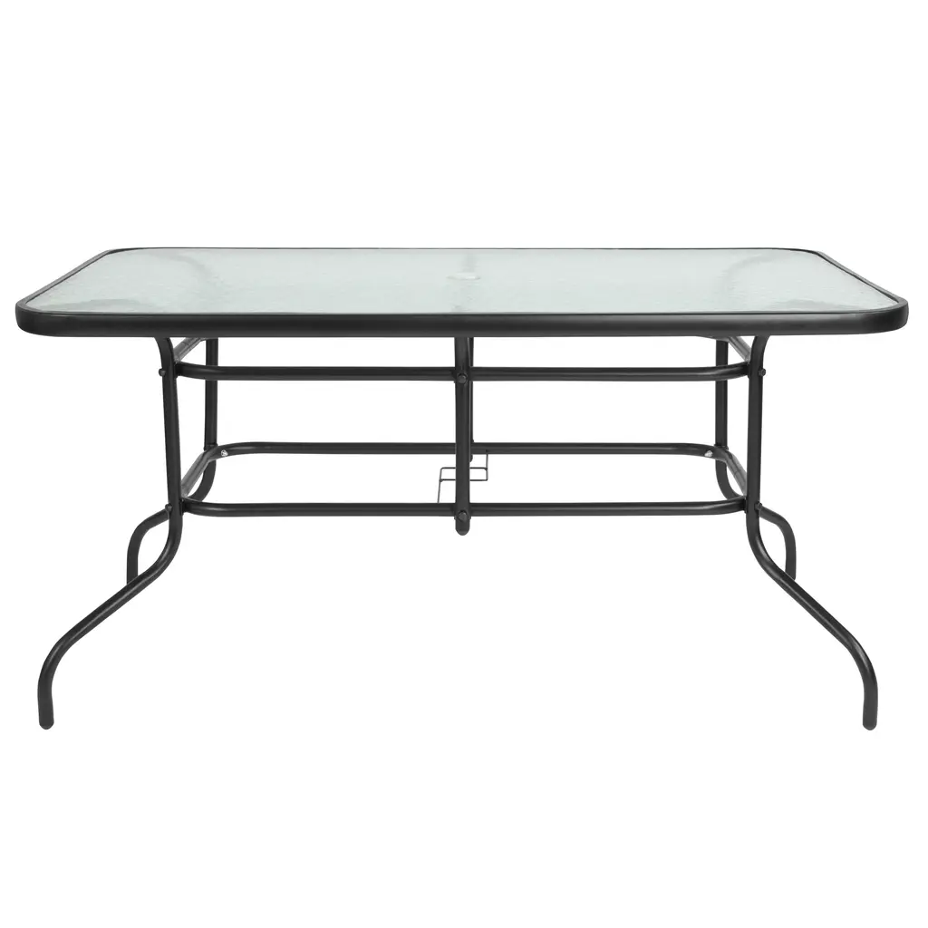 Have the beautiful patio or deck setting you've always wanted at your home or business with this modern outdoor patio dining set for 4. The sizable rectangular outdoor glass table has a designer rippled look, but is smooth to the touch to keep items level. The metal base and frame provide a striking contrast to the glass top for an on-trend look. The overall design is enhanced by the aluminum slat back chairs, with gently sloping arms, that are comfortably designed to help relieve the pressure from your upper body. Serve meals outside for a change of pace with no worries. This outdoor patio table boasts a solid steel frame that will hold up to 130 Lbs. weight capacity and the aluminum slat back chairs will hold up to 440 pounds to accommodate most users. The weather-resistant frames are designed to be enjoyed no matter the season. For longevity, care should be taken to protect from long periods of wet weather. Lightweight and stackable, the commercial grade patio chairs can be stacked up to 22 chairs high to store or clean your outdoor dining space. With plenty of space on this glass top patio table for everyone to have elbow room you'll get to take advantage of the outdoors more often while you enjoy time with friends and family.