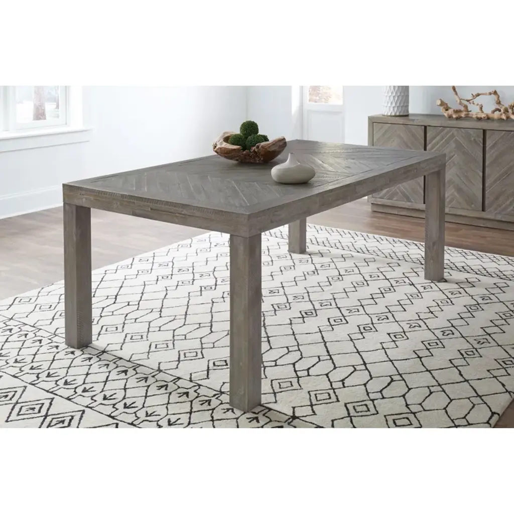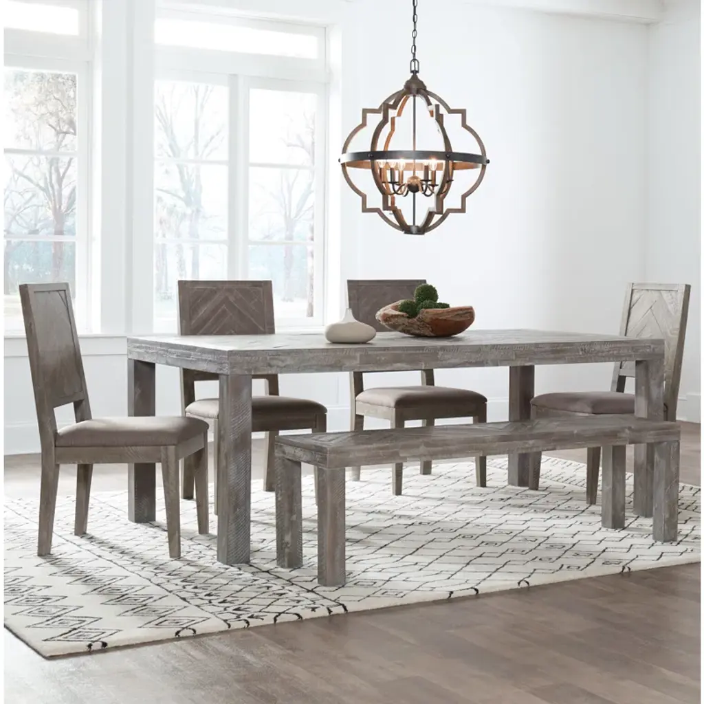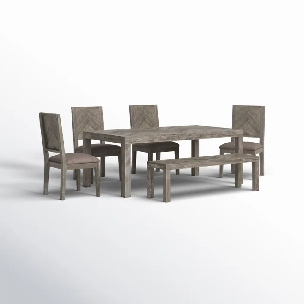 Crafted from roughhewn Acacia wood, this 6-piece dining set includes a bench, four chairs, and a rectangular dining table. Each piece features hand-selected planks of solid wood that are carefully sanded, stained, and whitewashed for a driftwood appearance that accentuates the active grain and draws out the natural knots and markings from the milling process. The bench, chair backs, and tabletop feature a solid wood exterior that's inlaid over engineered wood to create the striking herringbone pattern we love. The seats are upholstered in rich linen and filled with foam for added comfort that lasts – all the way from appetizers through after-dinner drinks.