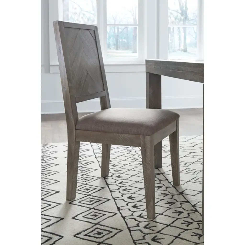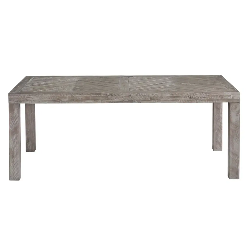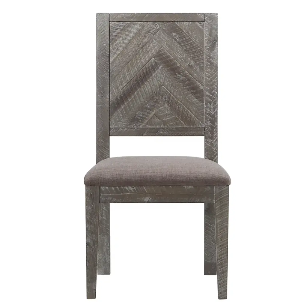 Crafted from roughhewn Acacia wood, this 6-piece dining set includes a bench, four chairs, and a rectangular dining table. Each piece features hand-selected planks of solid wood that are carefully sanded, stained, and whitewashed for a driftwood appearance that accentuates the active grain and draws out the natural knots and markings from the milling process. The bench, chair backs, and tabletop feature a solid wood exterior that's inlaid over engineered wood to create the striking herringbone pattern we love. The seats are upholstered in rich linen and filled with foam for added comfort that lasts – all the way from appetizers through after-dinner drinks.