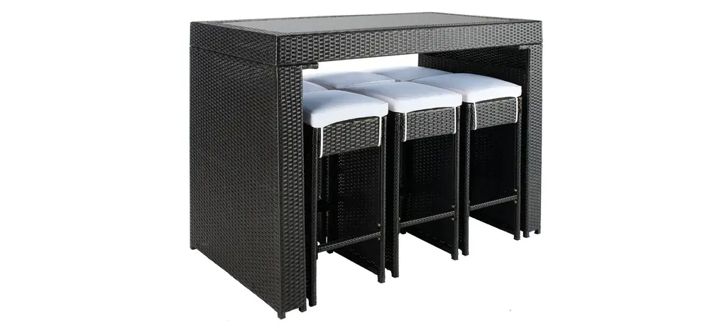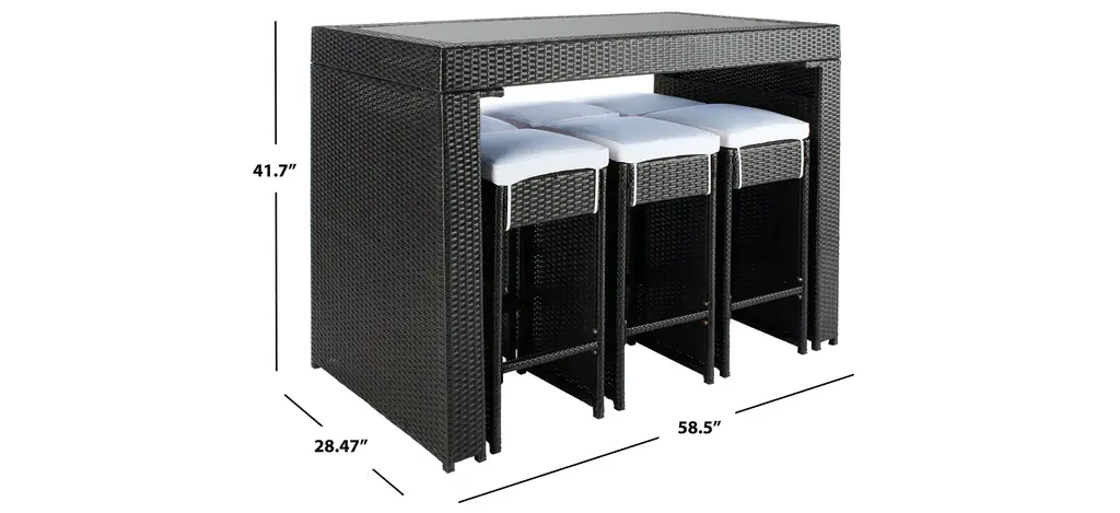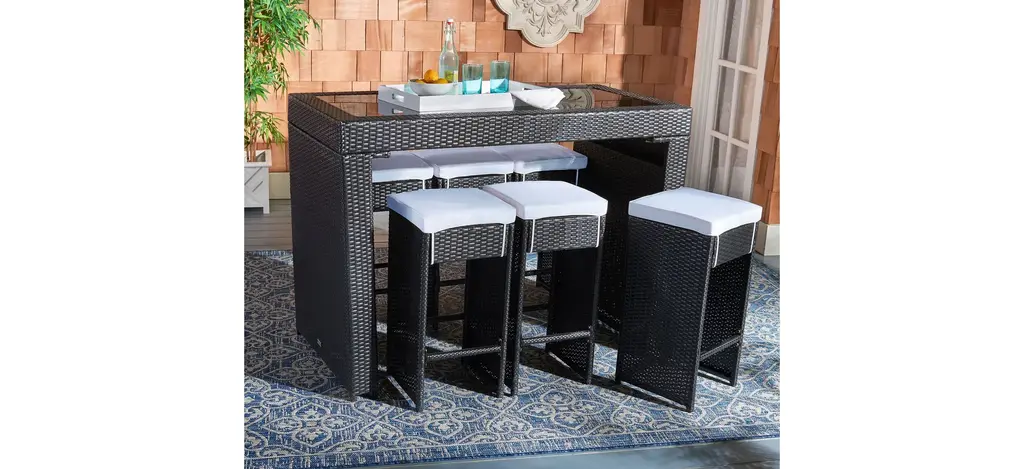 Pairing clean architectural lines with a rippling surface, this Bryant 7-pc. Outdoor Dining Set is both beautiful and hardworking. Bryant flaunts its Parsons style table and six stools in forever chic aesthetic with luxuriously plush cushions in designer smart colors to complement any patio or porch's decor.