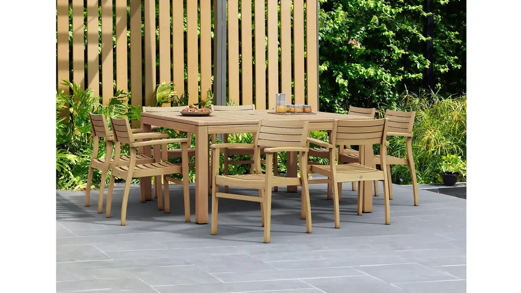 The Campos 9-pc. Outdoor Round Patio Dining Table Set focuses on contemporary and modern designs, that is perfect for any outdoor space. The patio set is made of wood materials are made of 100% FSC certified eucalyptus and certified high-quality teak wood.
