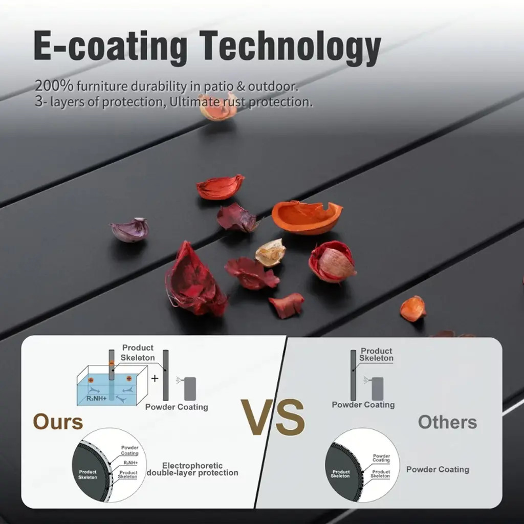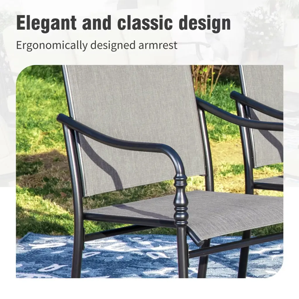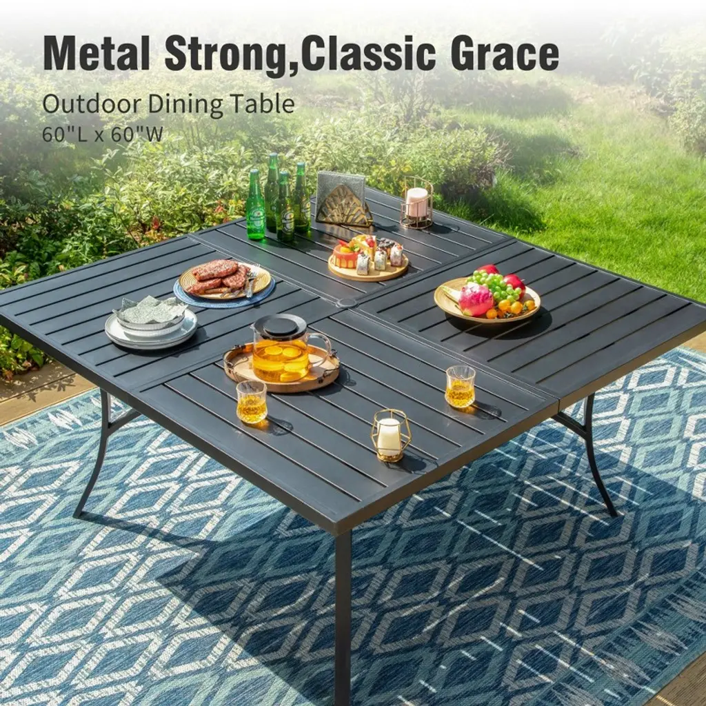 Enhance your outdoor dining with our 9pc Patio Dining Set. The spacious 60 inches x 60 inches square metal table features a slatted top that prevents water accumulation for easy maintenance. Equipped with a 1.57 inches pre-cut umbrella hole for UV protection, this table combines functionality and style. These steel frame patio chairs are expertly designed to combine comfort and style. Built for all-weather use, each chair supports up to 300 lbs. Crafted from durable E-coated and powder-coated steel, this set ensures long-lasting enjoyment. Transform your patio or backyard into an inviting space with this versatile dining table!
