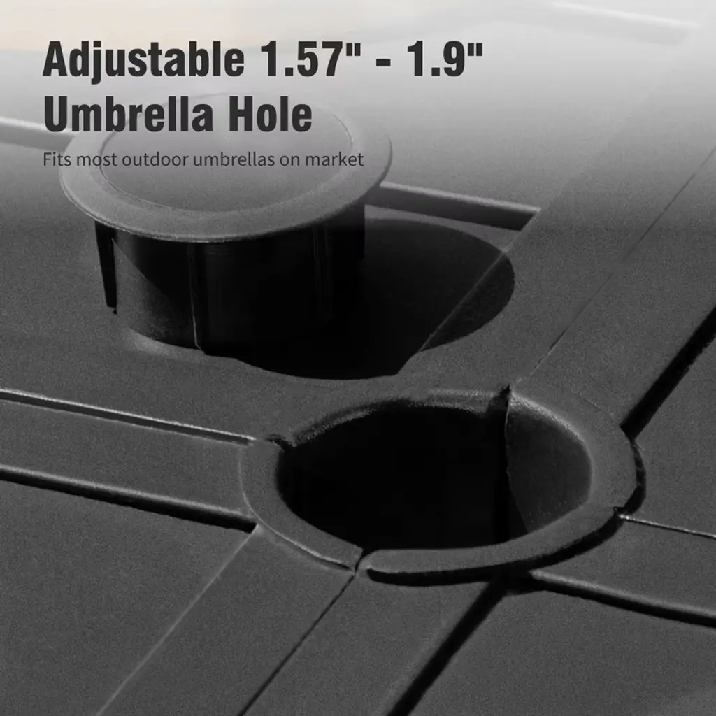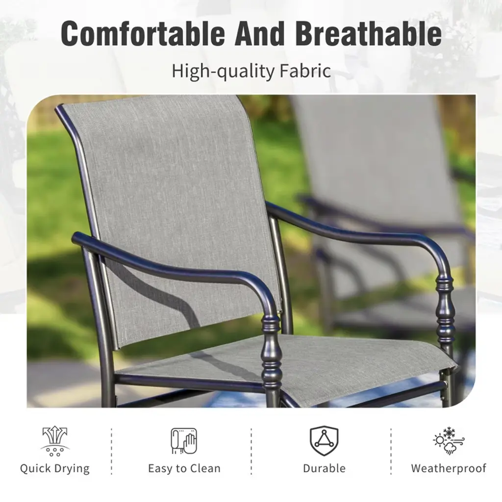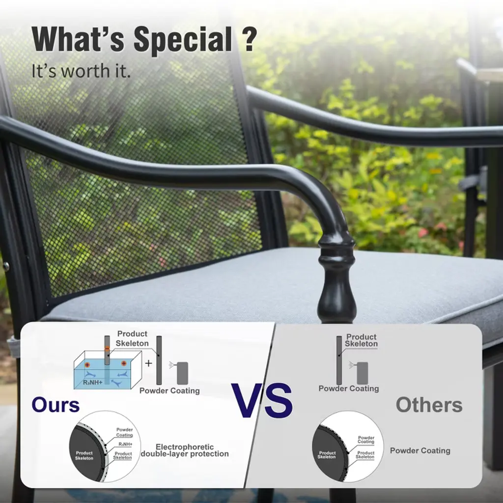 Enhance your outdoor dining with our 9pc Patio Dining Set. The spacious 60 inches x 60 inches square metal table features a slatted top that prevents water accumulation for easy maintenance. Equipped with a 1.57 inches pre-cut umbrella hole for UV protection, this table combines functionality and style. These steel frame patio chairs are expertly designed to combine comfort and style. Built for all-weather use, each chair supports up to 300 lbs. Crafted from durable E-coated and powder-coated steel, this set ensures long-lasting enjoyment. Transform your patio or backyard into an inviting space with this versatile dining table!