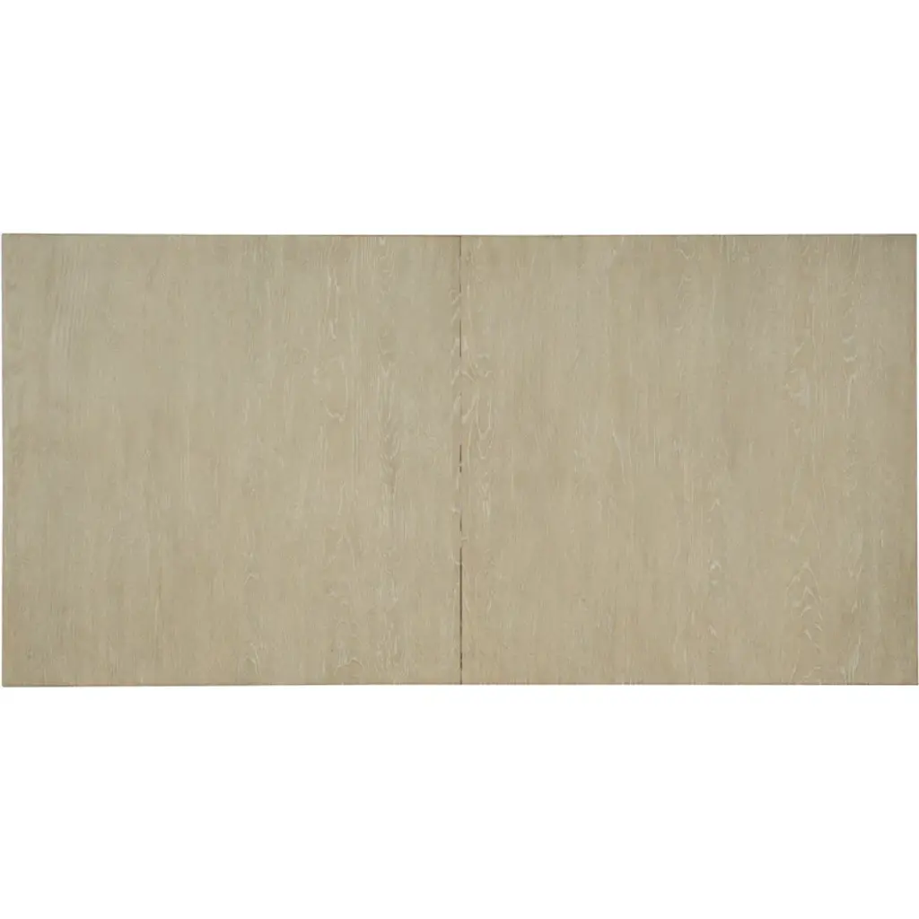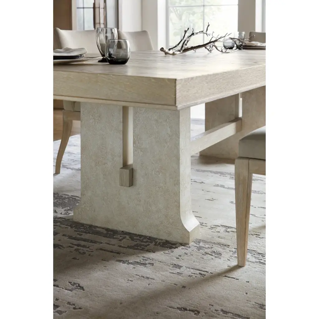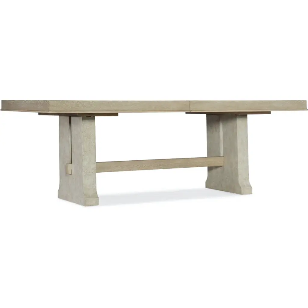 Linger for memorable meals with family and friends at this inviting modern farmhouse-style table that offers a retreat from your fast-paced lifestyle. Crafted of oak veneers, the rectangle dining table features a stretcher that joins the 2-pedestal base, with the entire base finished in a creamy-colored textured gesso with crackle. The tabletop is a soft taupe finish on oak veneers with dry brushing.