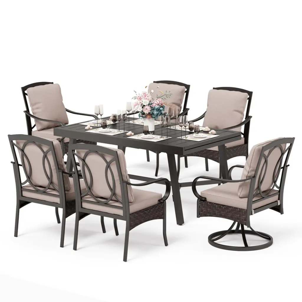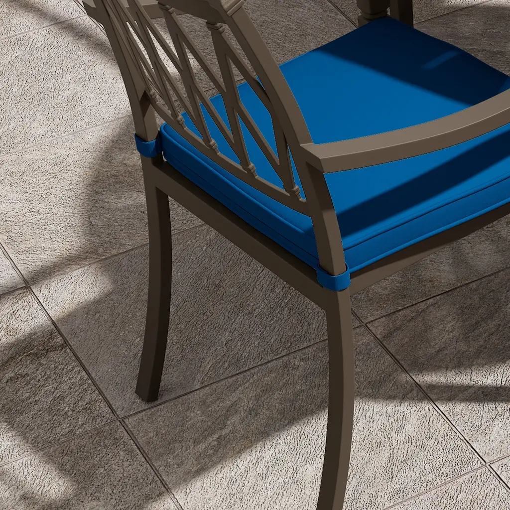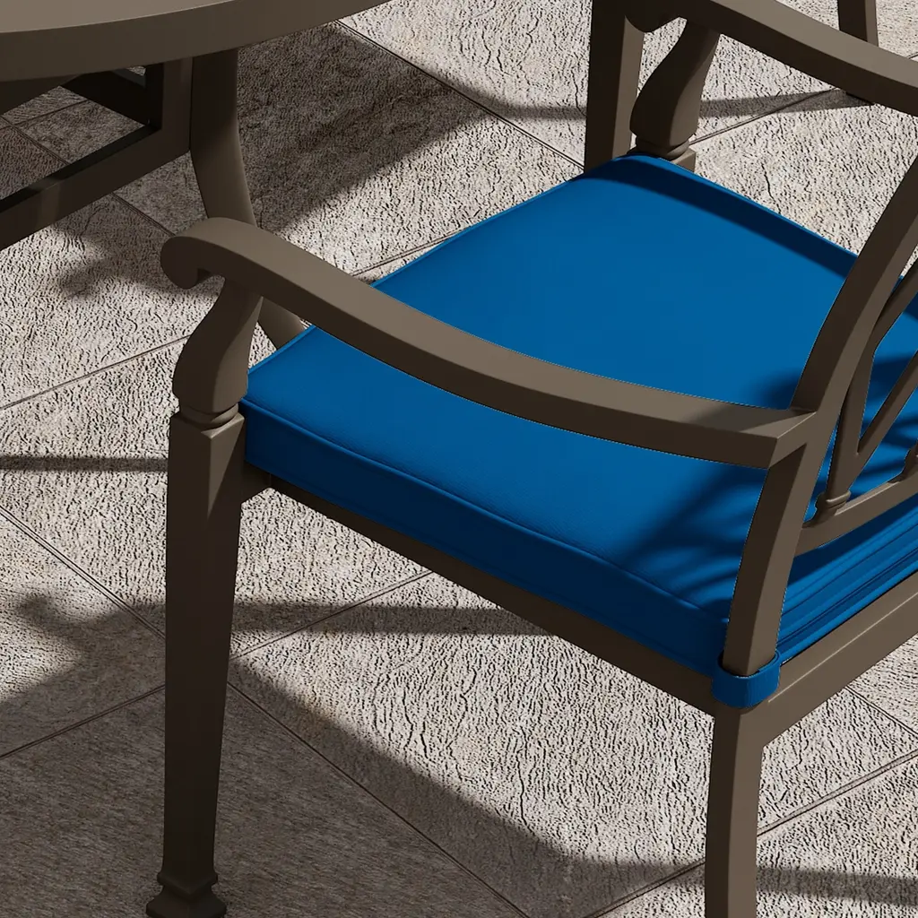 This ornamental and functional outdoor dining chair will enhance your outdoor living quality! The graceful streamlines outline a unique diagonal grid pattern that is beautiful to behold. The high-quality cast aluminum frame makes it more weather-resistant. In addition, the ergonomic curved design allows you and your friends to sit all day without getting tired, and the matching extra-thick 5cm olefin cushion makes you feel as if you are sitting on cotton. You can use it with other outdoor tables to create a comfortable and cozy outdoor life with your family and friends. 1. Vintage design: Exquisite hollowed out diagonal grid design with vintage colors adds a high-end atmosphere, elegant and gorgeous temperament to this patio dining chair, making it a classic outdoor artwork 2. High Quality Olefin Cushion: This cushion is 5cm thick, Olefin material makes it weather-resistant and durable, more suitable for outdoor patio use, removable design for easy cleaning and replacement 3. Cast Aluminum Frame: Artificially painted cast aluminum is not only smooth to the touch, but also has superb weather resistance, long-lasting use to enjoy for many years 4. Ergonomic Design: The ergonomically designed backrest and armrests provide maximum relaxation for you and your friends while chatting and dining. 5. Adjustable Foot pads: Equipped with adjustable foot pads to provide extra stability and keep it level even on uneven surfaces. 6. Extra Wide Design: Compared to other ordinary outdoor dining chairs, this 23 inch spacious seating width dining chair allows you to enjoy the maximum comfort. 7. No Assembly Required: This outdoor dining chair comes ready to use straight out of the box!