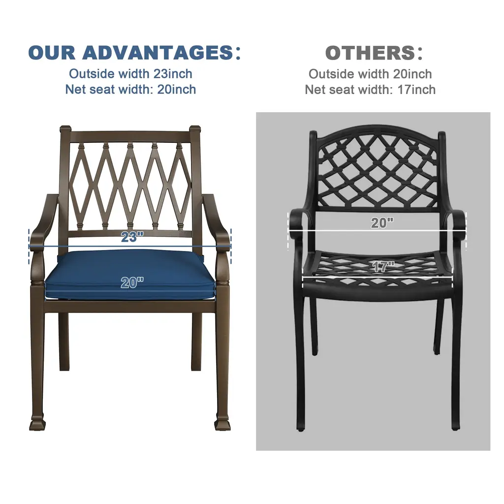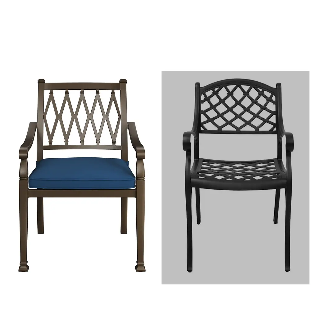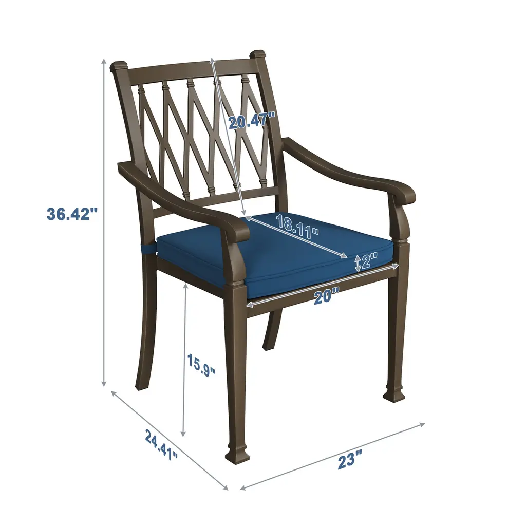 This ornamental and functional outdoor dining chair will enhance your outdoor living quality! The graceful streamlines outline a unique diagonal grid pattern that is beautiful to behold. The high-quality cast aluminum frame makes it more weather-resistant. In addition, the ergonomic curved design allows you and your friends to sit all day without getting tired, and the matching extra-thick 5cm olefin cushion makes you feel as if you are sitting on cotton. You can use it with other outdoor tables to create a comfortable and cozy outdoor life with your family and friends. 1. Vintage design: Exquisite hollowed out diagonal grid design with vintage colors adds a high-end atmosphere, elegant and gorgeous temperament to this patio dining chair, making it a classic outdoor artwork 2. High Quality Olefin Cushion: This cushion is 5cm thick, Olefin material makes it weather-resistant and durable, more suitable for outdoor patio use, removable design for easy cleaning and replacement 3. Cast Aluminum Frame: Artificially painted cast aluminum is not only smooth to the touch, but also has superb weather resistance, long-lasting use to enjoy for many years 4. Ergonomic Design: The ergonomically designed backrest and armrests provide maximum relaxation for you and your friends while chatting and dining. 5. Adjustable Foot pads: Equipped with adjustable foot pads to provide extra stability and keep it level even on uneven surfaces. 6. Extra Wide Design: Compared to other ordinary outdoor dining chairs, this 23 inch spacious seating width dining chair allows you to enjoy the maximum comfort. 7. No Assembly Required: This outdoor dining chair comes ready to use straight out of the box!