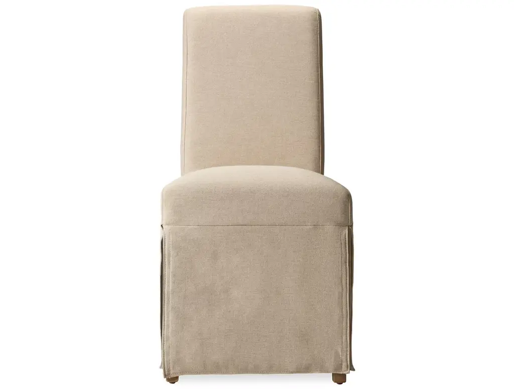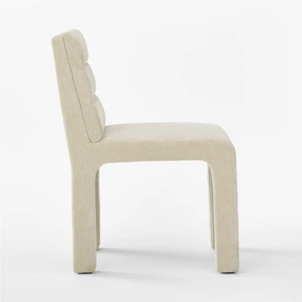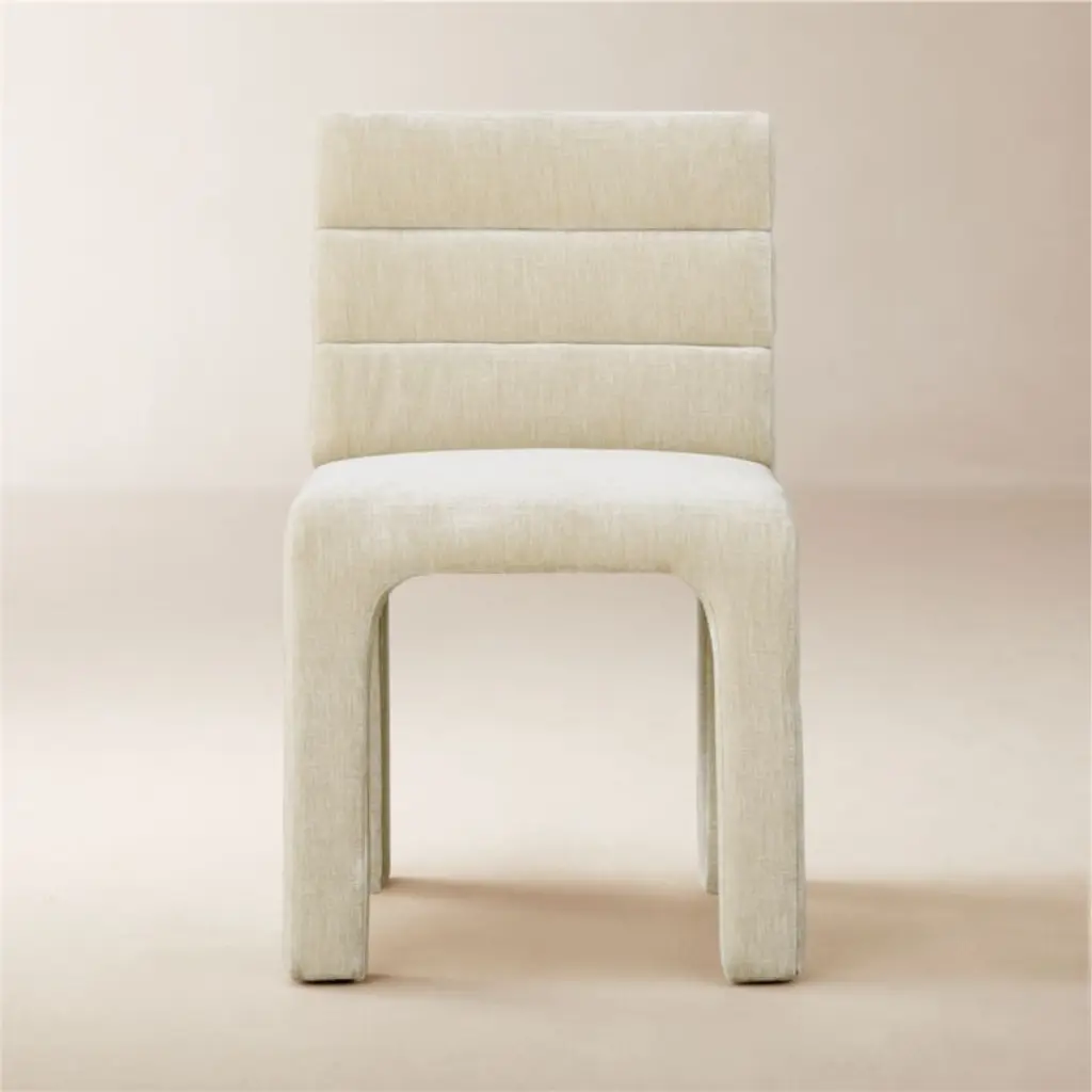 Designed by Brett Beldock, cream dining chair brings a bold, architectural aesthetic to dining. Fully upholstered in tufted channels of performance fabric, dining chair stands up to dirt and stains. Wood frame is certified sustainable by the Forest Stewardship Council . CB2 exclusive.