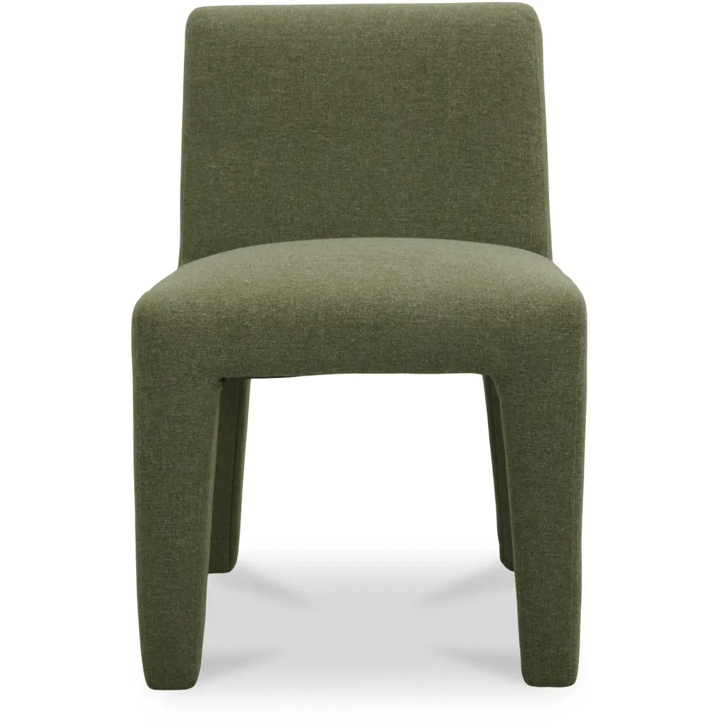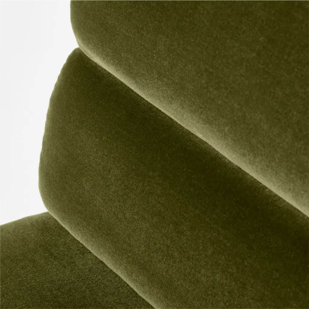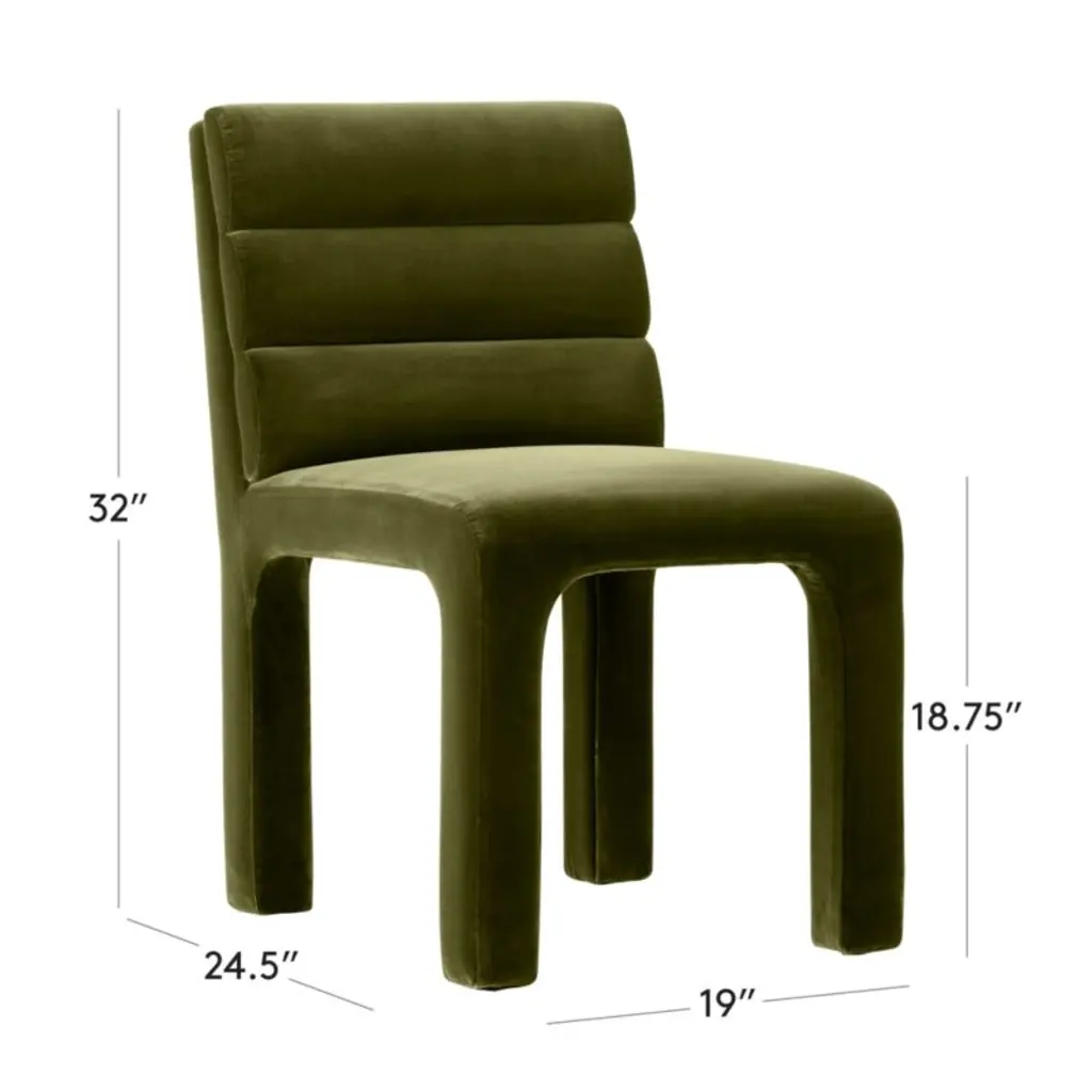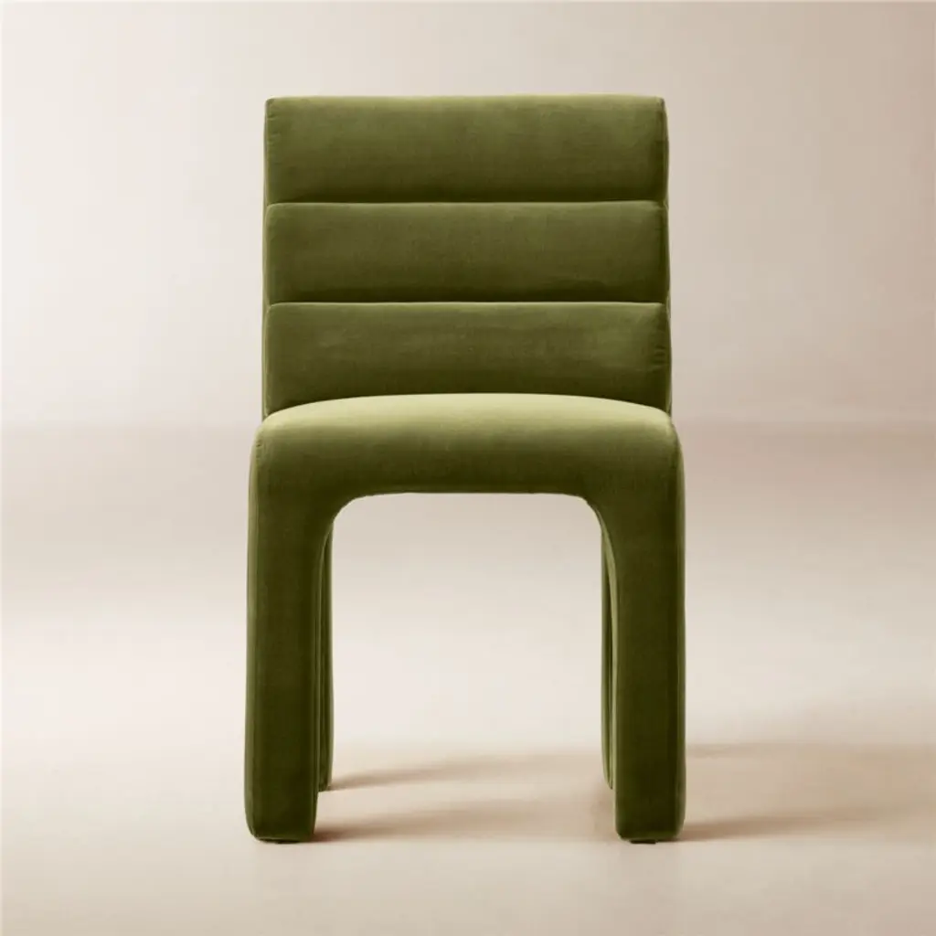 Designed by Brett Beldock, rich green dining chair brings a bold, architectural aesthetic to dining. Fully upholstered in tufted channels of soft velvet, dining chair stands up to dirt and stains. Wood frame is certified sustainable by the Forest Stewardship Council . CB2 exclusive.