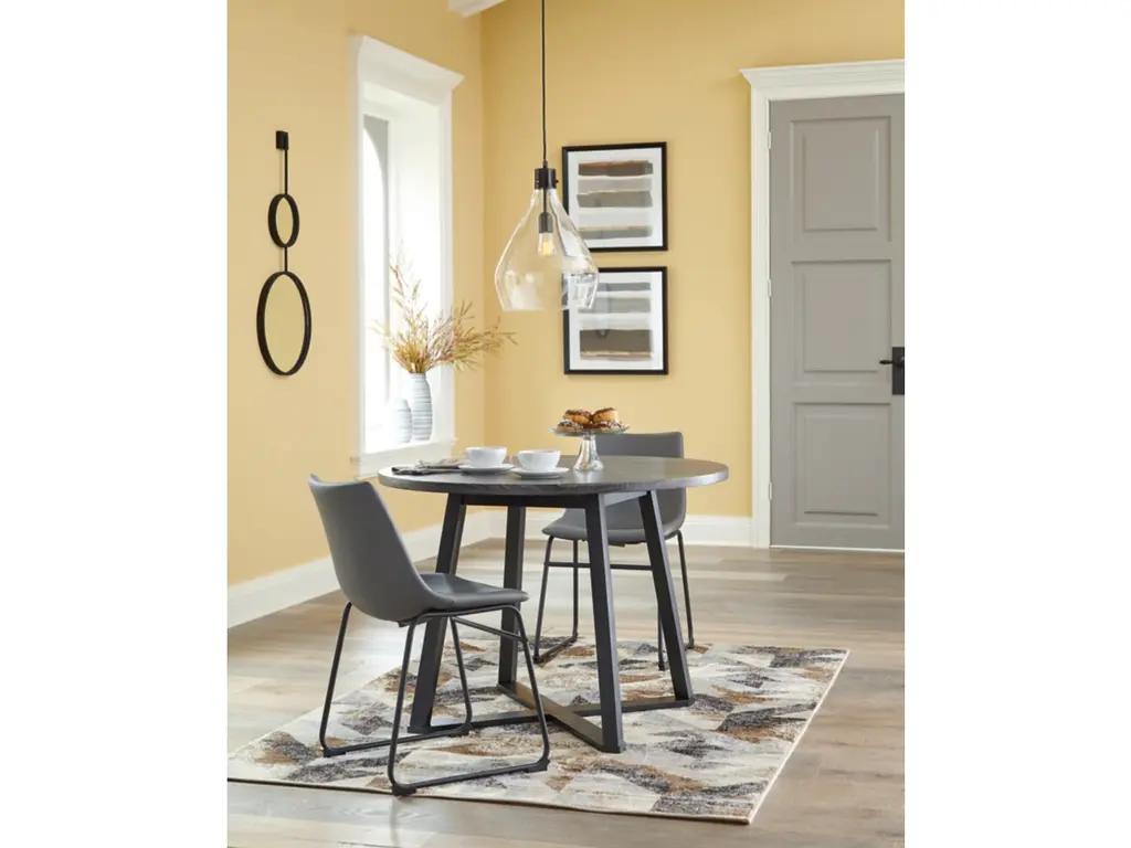 With its distinctive features, the striking Centiar dining set serves up a fresh twist on mid-century inspired style. The chair’s chic gray faux leather upholstery adds to the aesthetic. The table’s mixed material and two-tone aesthetic are beautifully in balance. Sporting a dramatic charcoal gray hue, the top is crafted of durable melamine, allowing it to weather years of family thrills and spills. What a timeless look for eat-in kitchens and casually cool dining rooms.