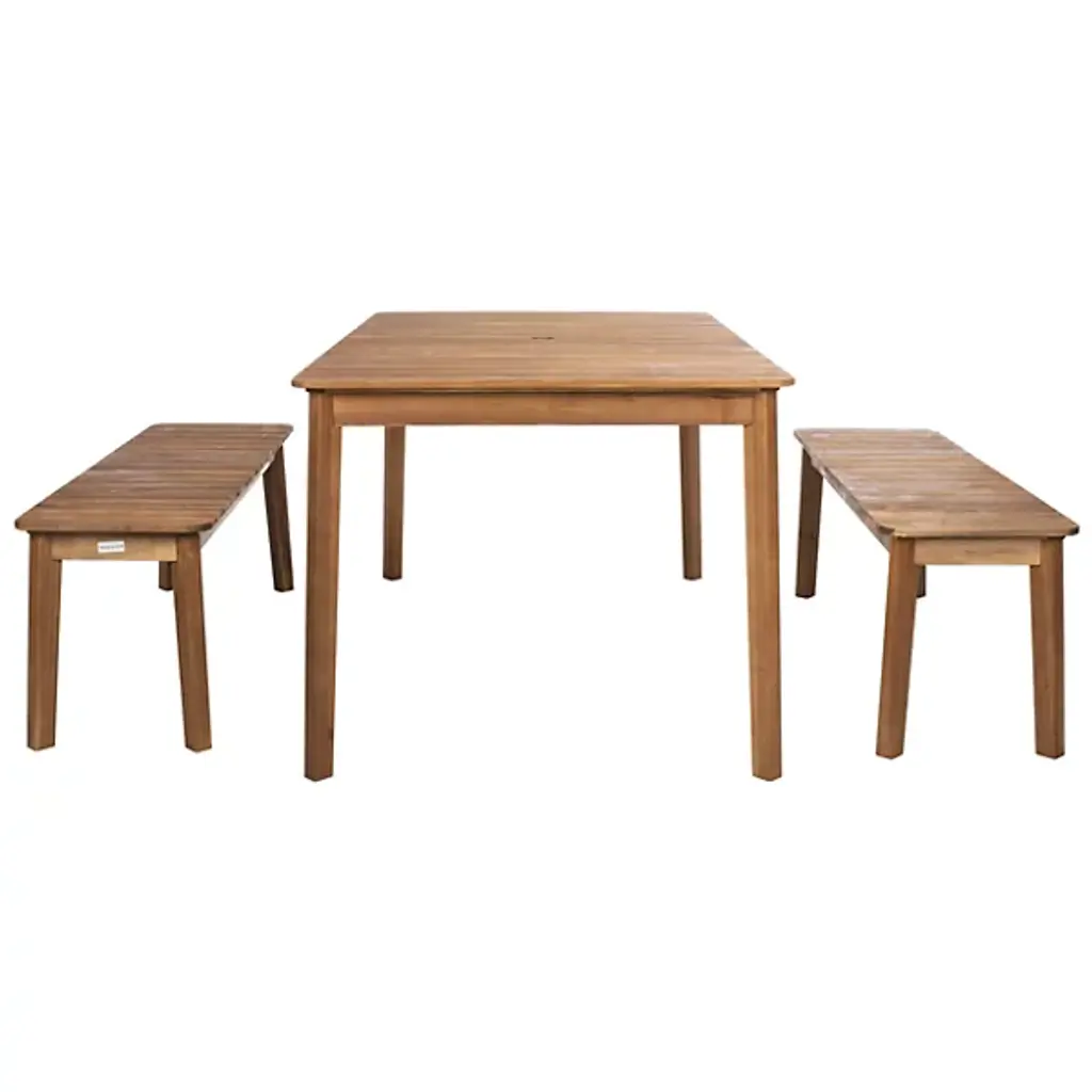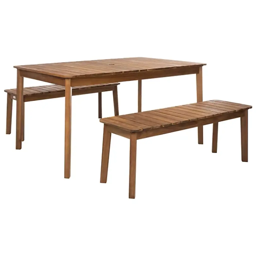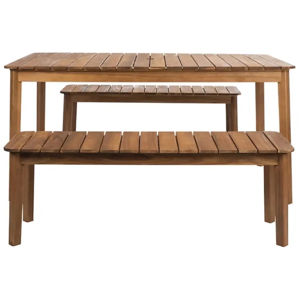 Elevate your outdoor entertaining with the Chenery Outdoor Dining Set from Alder & Ore, designed for both style and functionality. Featuring clean, straightforward lines and crafted from rich acacia wood, this set includes a spacious dining table and two sturdy benches, perfect for gathering with friends and family. The table features a convenient umbrella opening to keep you cool and shaded during meals. Ideal for backyard dining or casual get-togethers, this dining set adds sophistication to any outdoor space.