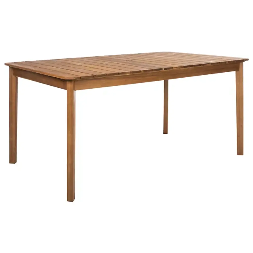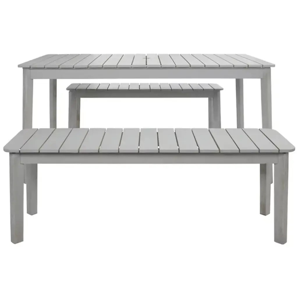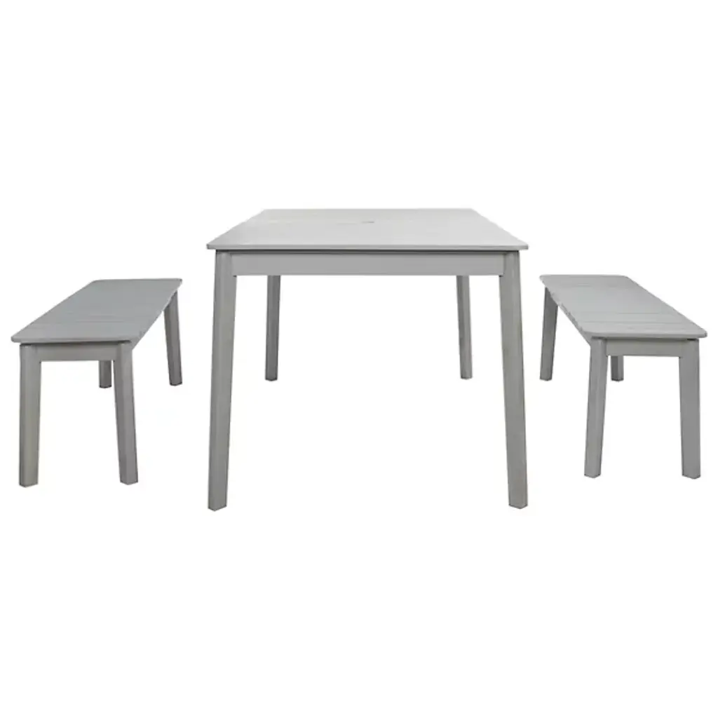 Elevate your outdoor entertaining with the Chenery Outdoor Dining Set from Alder & Ore, designed for both style and functionality. Featuring clean, straightforward lines and crafted from rich acacia wood, this set includes a spacious dining table and two sturdy benches, perfect for gathering with friends and family. The table features a convenient umbrella opening to keep you cool and shaded during meals. Ideal for backyard dining or casual get-togethers, this dining set adds sophistication to any outdoor space.