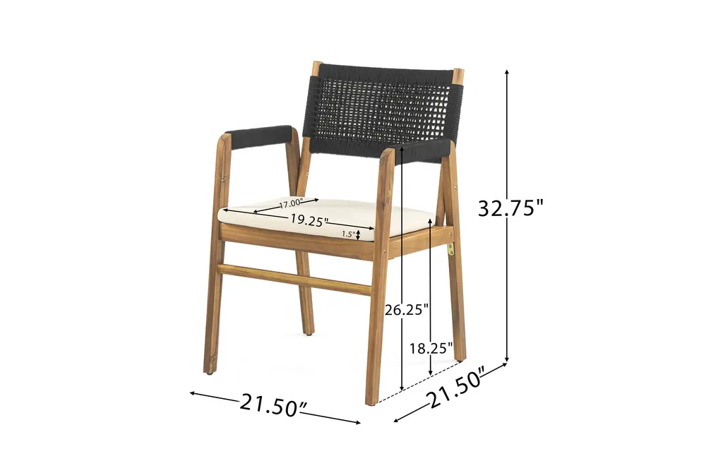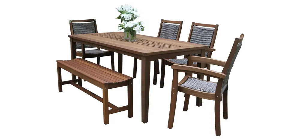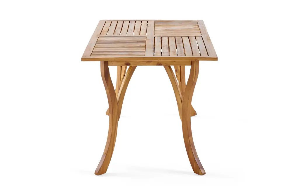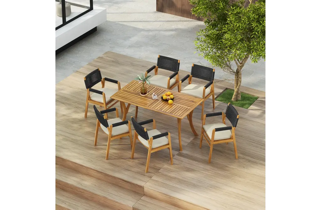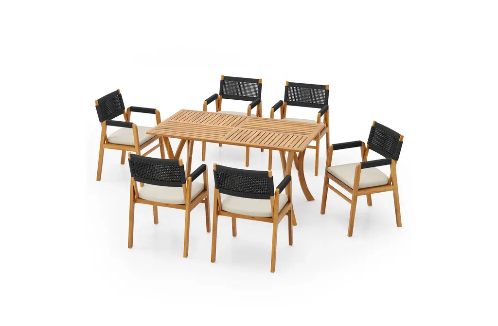 Solid Acacia Wood Construction: This 7-piece outdoor dining set features a 59" rectangular table and six matching chairs, all crafted from high-quality acacia wood. The table's teak finish enhances its natural beauty, while the robust wood construction ensures long-lasting durability, even in the harshest outdoor conditions.Sophisticated Slat Design & Curved Elegance: The table's classic slatted design and curved legs add sophistication to any outdoor space. 59" table comfortably seats six, providing ample seating for family gatherings, alfresco dining, or casual get-togethers.Comfortable and Supportive Chairs: The dining chairs offer ultimate comfort with a soft cushion and a unique black rope-woven backrest. The breathable design ensures support and ventilation, so you can relax and enjoy meals without discomfort.Weather-Resistant & Easy to Clean: Both the table and chairs are designed to withstand outdoor elements, with the acacia wood naturally resistant to moisture, UV rays, and temperature changes. The smooth, slatted tabletop is easy to wipe clean after meals or use.Ideal for Entertaining Outdoors: This set is perfect for hosting family dinners or casual gatherings. Some assembly is required for this dining set, with all tools and instructions included for easy setup.Includes: One (1) Dining Table, Six (6) Dining ChairsMaterial: Acacia Wood + Rope + FabricColor: Multiple OptionsAssembly RequiredTable Dimensions: 31.50 inches deep x 59.00 inches wide x 30.00 inches highChair Dimensions: 21.50 inches deep x 21.50 inches wide x 32.75 inches high