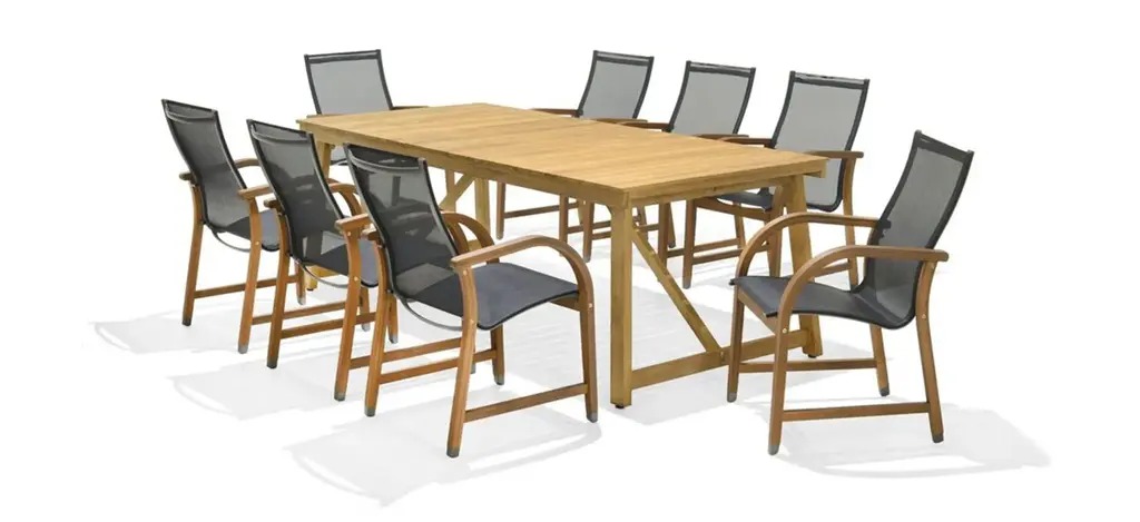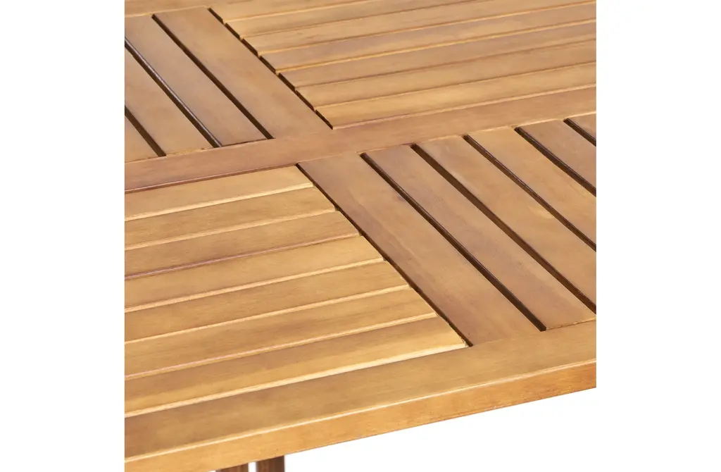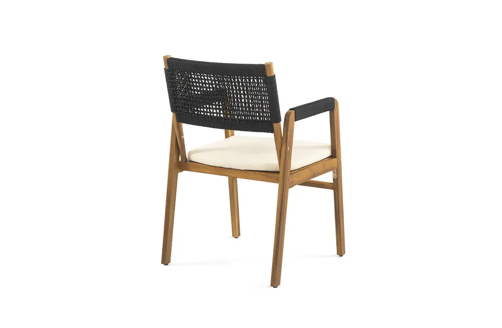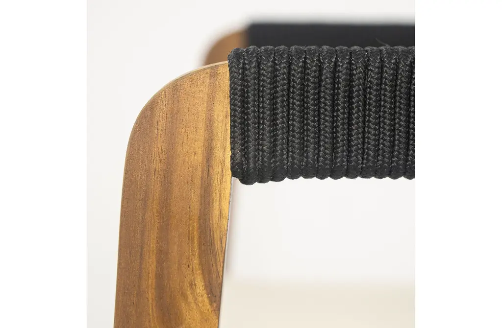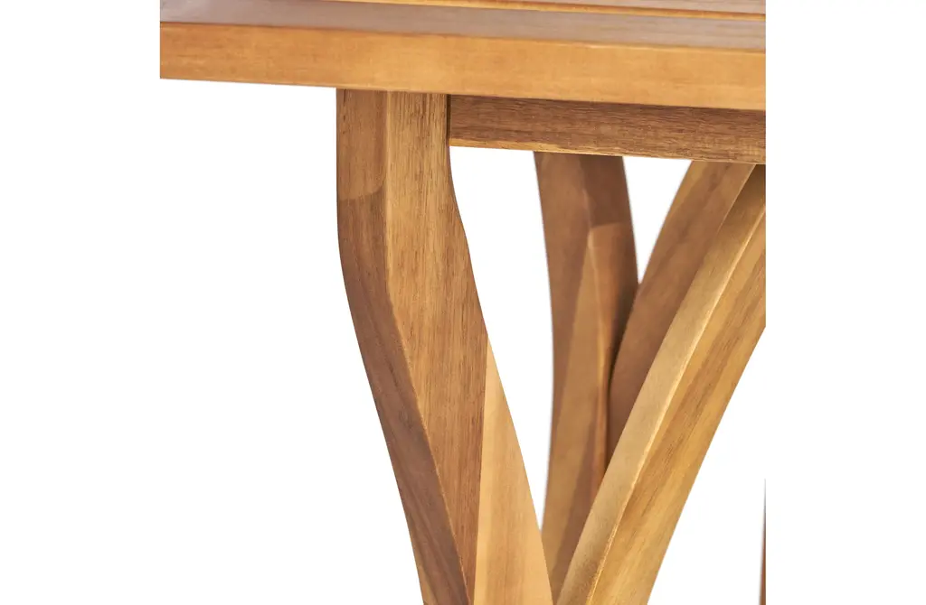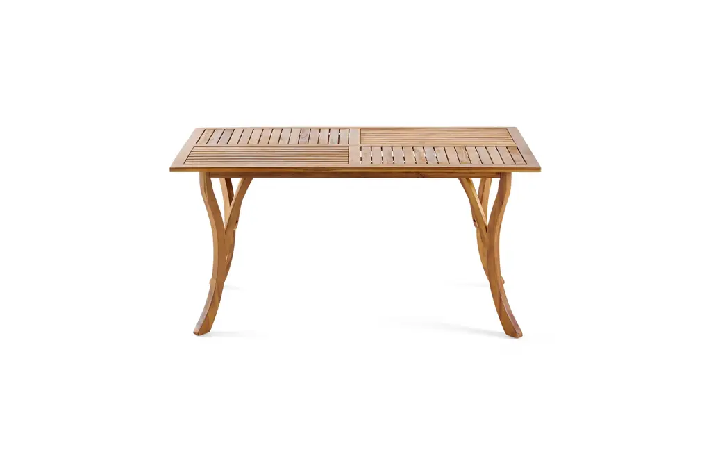 Solid Acacia Wood Construction: This 7-piece outdoor dining set features a 59" rectangular table and six matching chairs, all crafted from high-quality acacia wood. The table's teak finish enhances its natural beauty, while the robust wood construction ensures long-lasting durability, even in the harshest outdoor conditions.Sophisticated Slat Design & Curved Elegance: The table's classic slatted design and curved legs add sophistication to any outdoor space. 59" table comfortably seats six, providing ample seating for family gatherings, alfresco dining, or casual get-togethers.Comfortable and Supportive Chairs: The dining chairs offer ultimate comfort with a soft cushion and a unique black rope-woven backrest. The breathable design ensures support and ventilation, so you can relax and enjoy meals without discomfort.Weather-Resistant & Easy to Clean: Both the table and chairs are designed to withstand outdoor elements, with the acacia wood naturally resistant to moisture, UV rays, and temperature changes. The smooth, slatted tabletop is easy to wipe clean after meals or use.Ideal for Entertaining Outdoors: This set is perfect for hosting family dinners or casual gatherings. Some assembly is required for this dining set, with all tools and instructions included for easy setup.Includes: One (1) Dining Table, Six (6) Dining ChairsMaterial: Acacia Wood + Rope + FabricColor: Multiple OptionsAssembly RequiredTable Dimensions: 31.50 inches deep x 59.00 inches wide x 30.00 inches highChair Dimensions: 21.50 inches deep x 21.50 inches wide x 32.75 inches high