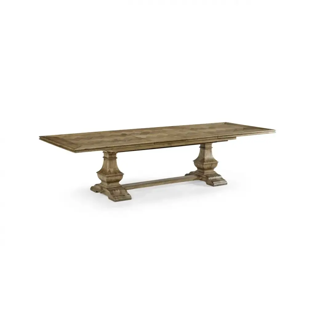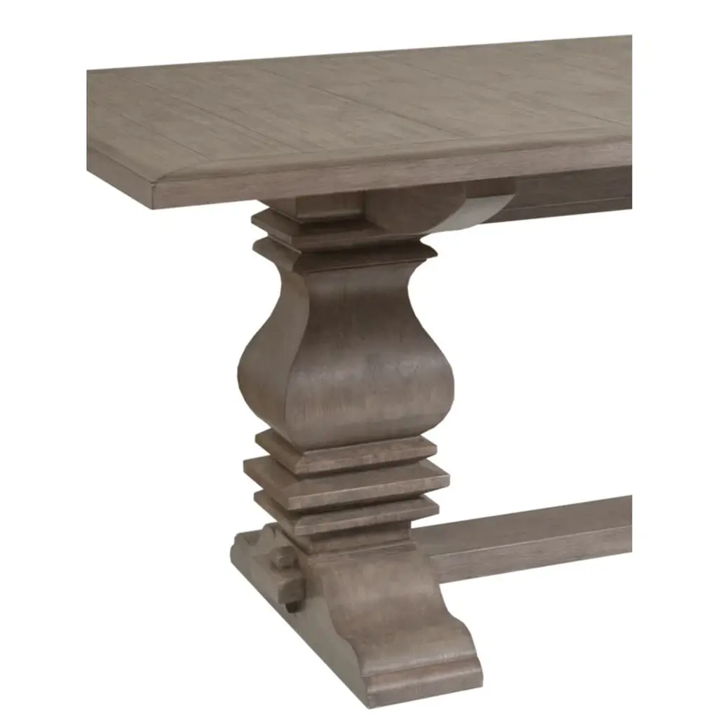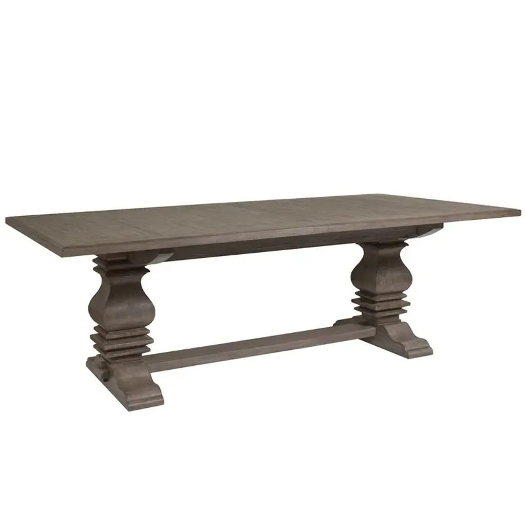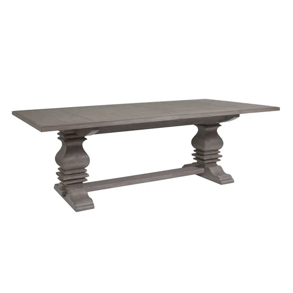 Casual designs crafted from mahogany veneers and select hardwoods. The Cohesion Program Extendable Dining Table extends with two leaves to seat 12 comfortably. The top features mitered corners and is scored for a plank effect balanced in design by the carved pedestal legs with a wooden stretcher.
