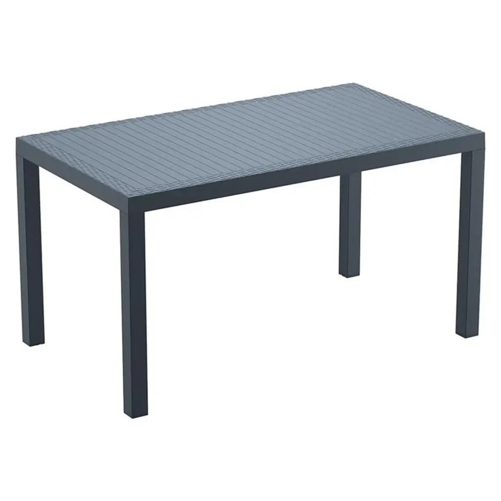 Orlando dining set with six dining chairs and one rectangle table. Unlike any other woven furniture in the market, wicker-look furniture will never unravel. Chairs have no metal parts to rust, no moving parts that can break — made for commercial durability. Perfect for home use or hotels and restaurants. UV treated. Hose down for cleaning. Withstands outdoor temperatures summer and winter. The table doesn't have an umbrella hole.Features:Finish: Dark GrayMade from commercial grade resinBeautiful woven wicker-lookBoth chairs and table are resistant to UV, chlorine, salt, stains, suntan oilsPerfect for heavy use in any indoor or outdoor areasWicker-look resin weave design; not woven, will not unravelWarranty: 2 years limited warranty (Residential use) and 1 year limited warranty (Commercial use)Easy no tool assembly requiredExtremely durable for outdoor temperaturesEasy to keep clean and maintenance freeChairs are stackableSet includes one dining table and six dining side chairsSpecifications:Chair Dimensions: 34" H x 18" W x 20.5" DDining Table Dimensions: 29" H x 55" W x 31.5" DSeat Height: 18"Overall Product Weight: 88 lbs