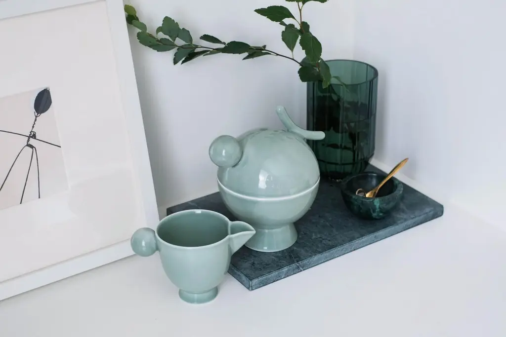 Tea pot n°1– Diameter 16 x height 18cmTea cup n°2– Diameter 10.5 x height 13.8 cmCoffee cup n°3– Diameter 10.5 x height 13.4 cmMilk jug n°4– Diameter 6.7 x height 8.6cmSugar bowl n°5– Diameter 12 x height 17.1 cmCeramic in glossy blue indigo or celadon green glaze finishThe tea and coffee set, handmade at Jingdezhen (???), the true heart of Ceramic in China, is an ode to craftsmanship and traditions. Including a teapot, teacup, coffee-cup, milk jug, sugar bowl, Ebeki is designed for the daily tea and coffee ritual.