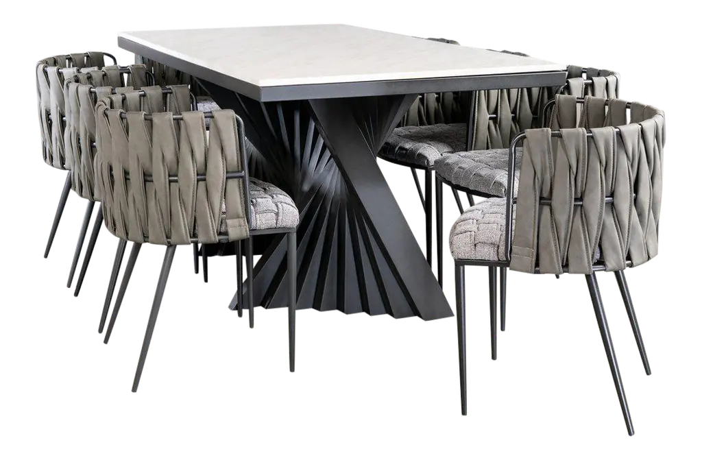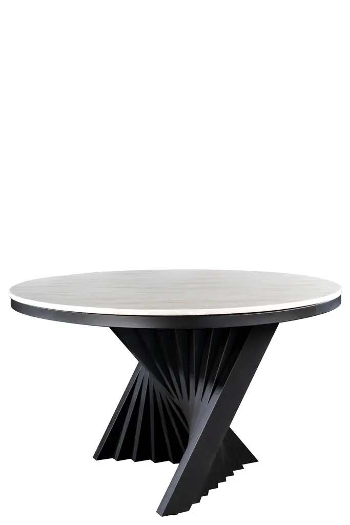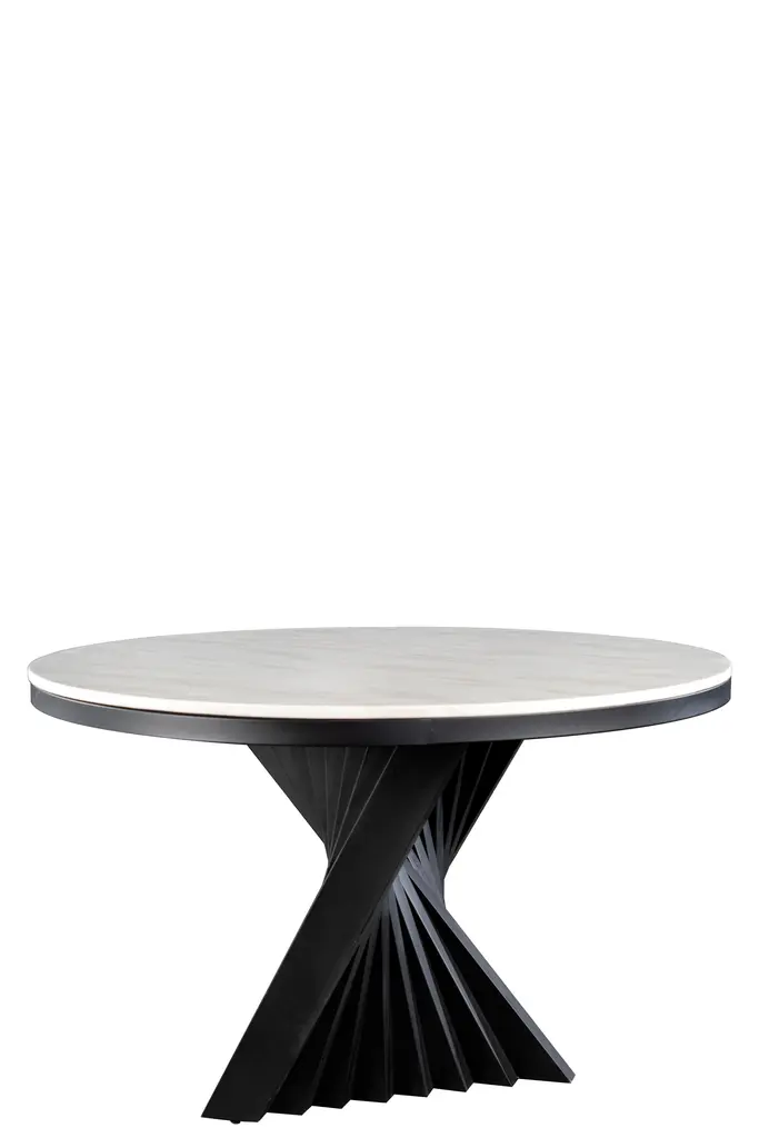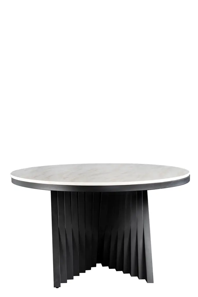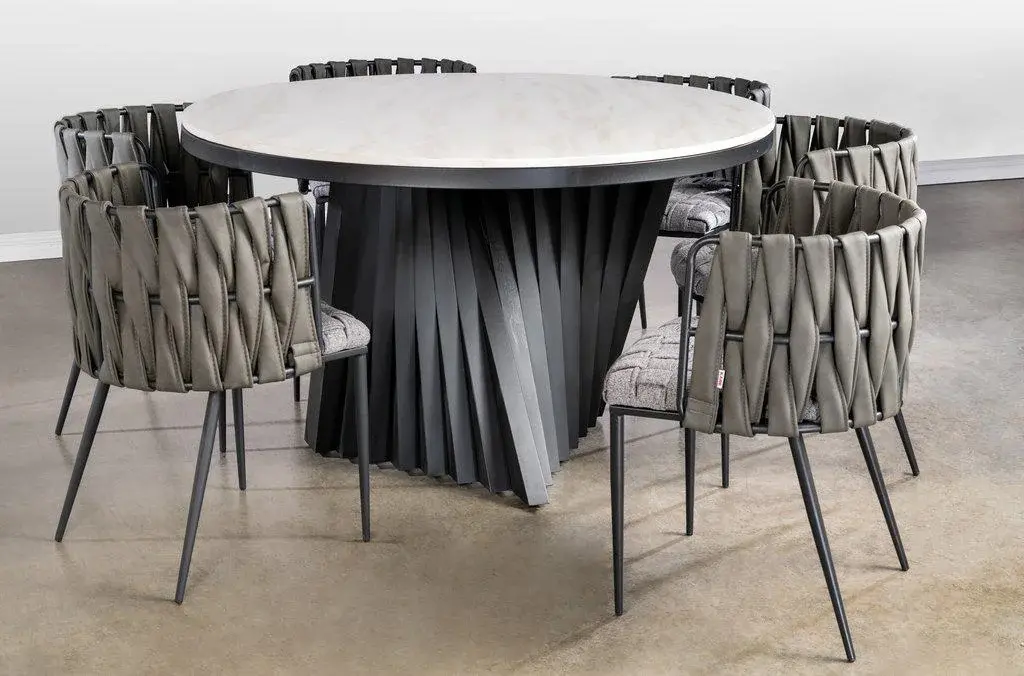 Round marble top waterfall dining set with seating for 6. Table : Materials : Marble, metal Measurements: 31.5"h x 51.5" w x 51.5"l, 208 pounds Colors: Black and white Base height: 28" Leg clearance: Between 26"-29.5" Chair : Materials: Metal, faux leather, linen Measurements : 19"w x 20.5"d x 29.5" h, 15 pounds Seat measurements: 18.5"dx18.5"w, Back: 12"h Seat height: 18" Color : Gray, Black