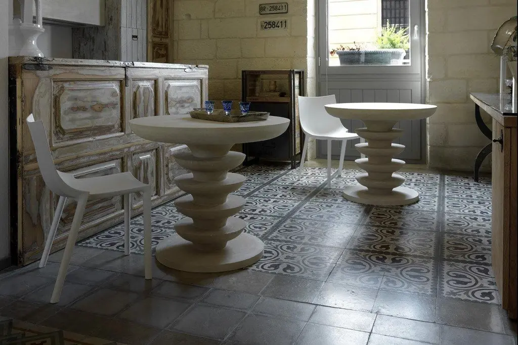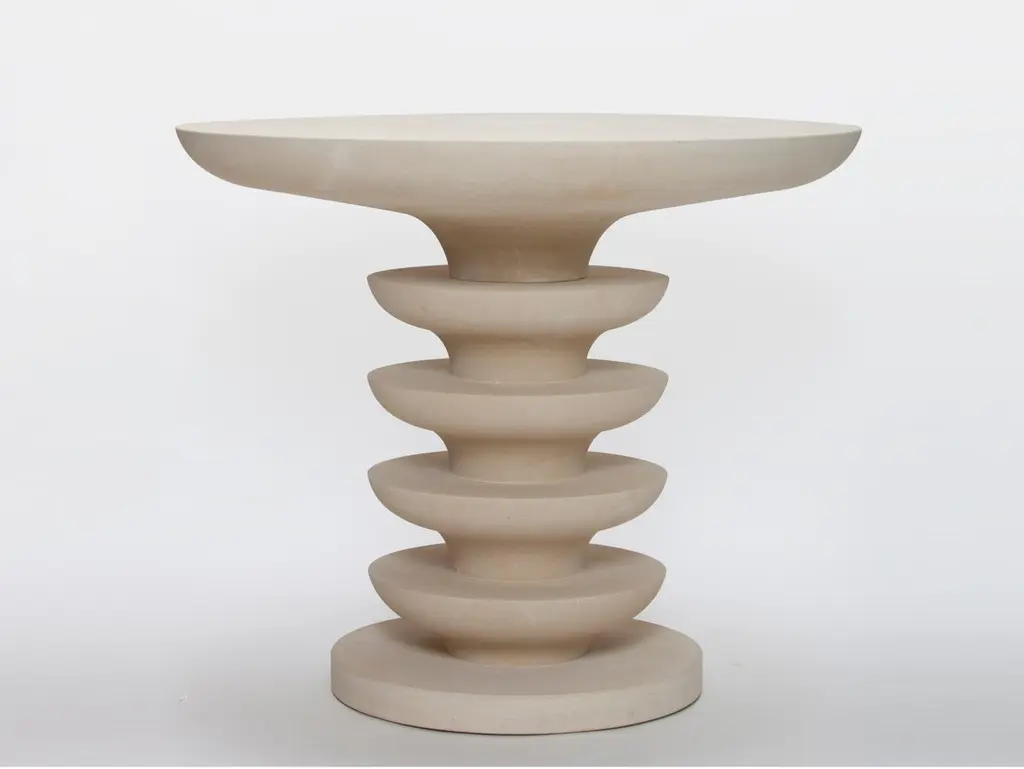 A sculptural beige limestone table suitable for indoor and outdoor settings.Materials: limestoneSize: 90 cm diameter x 75 cm heightWeight: 250 lbsMade In Italy.Please contact us if you have any questions about customization and pricing. We will be glad to check with the factory’s technical team if sizes, finishes, and colors can be customized. We do our best to expedite production and to ship and deliver product within the listed lead time, however current lead times might be longer due to global shipping backlog and delays. These delays are out of our control and cannot be a reason to cancel an order.