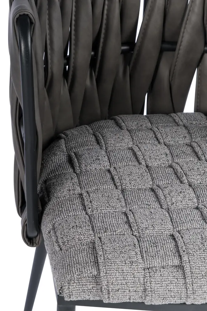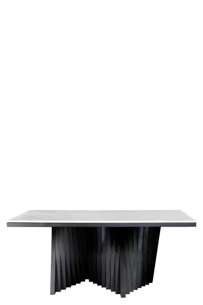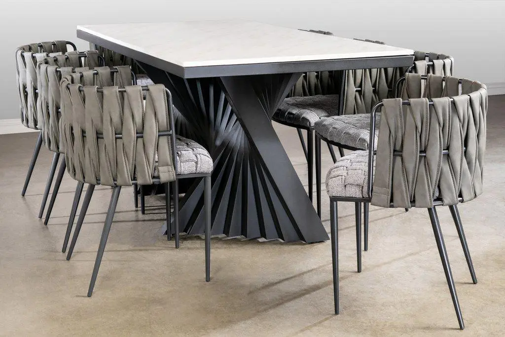 Black marble top waterfall dining set for 8 in gray. Table: Materials : Marble, metal Measurements: 32.75"h x 71"l x 35.5"w, 245 pounds Colors: Black and white Chair: Materials: Metal, faux leather, linen Measurements : 19"w x 20.5"d x 29.5" h, 15 pounds Seat measurements: 18.5"dx18.5"w, Back: 12"h Seat height: 18" Color : Gray, Black
