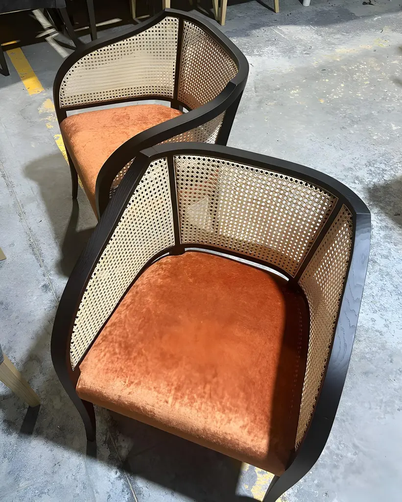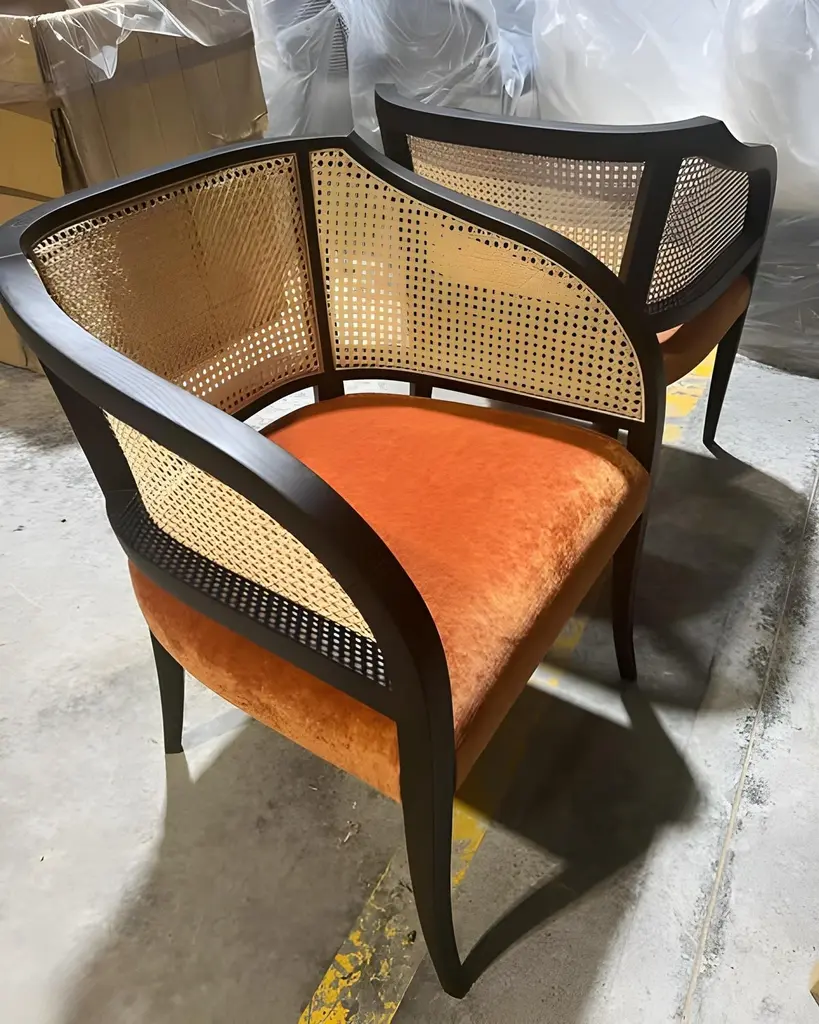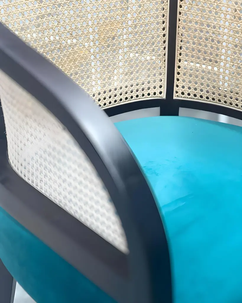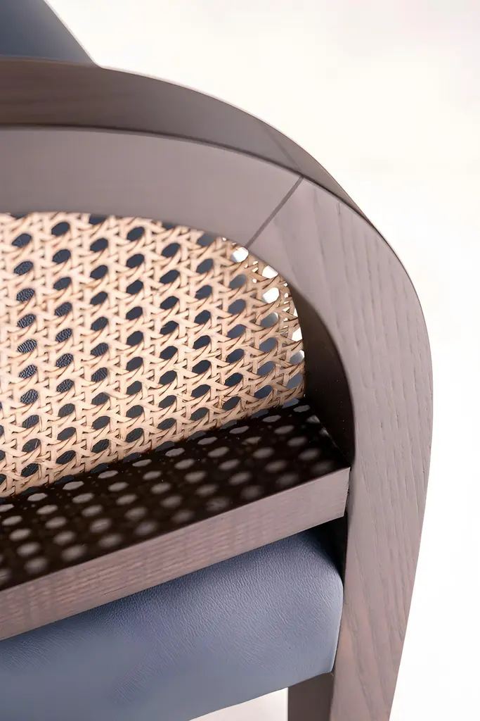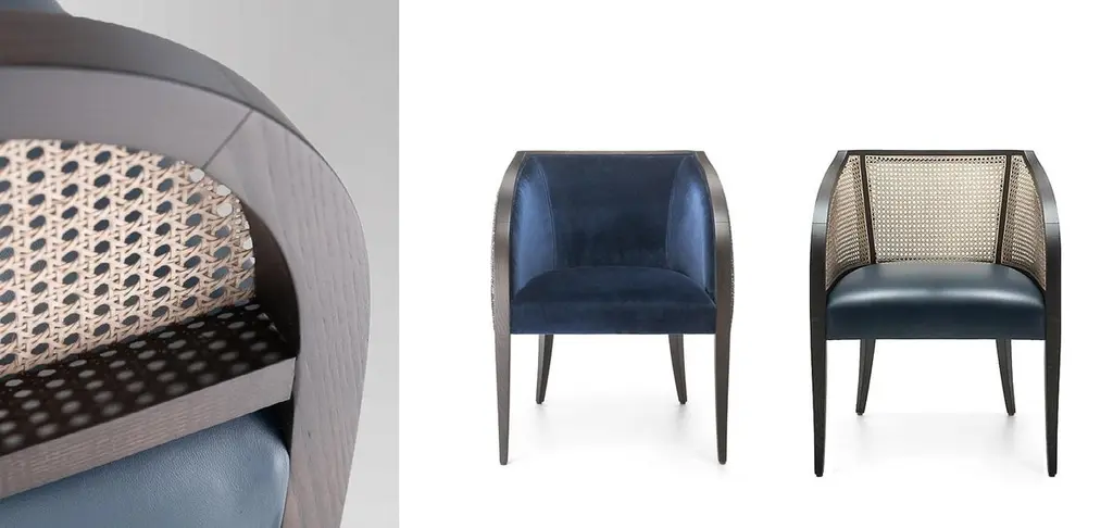 Built by hand from solid wood frame in dark ebony finish.Backrest in natural woven cane.Upholstered seat in black leather.Dimensions: W 47 cm x D 61 cm x H 77 cmMaterials: Wood, leather, rattanSeat H 46 cmAvailable in COM.Contact us to enquire about COM/COL production, requirements and material shipping instructions.Please contact us if you have any questions about customization and pricing. We will be glad to check with the factory’s technical team if sizes, finishes, and colors can be customized. We do our best to expedite production and to ship and deliver product within the listed lead time, however current lead times might be longer due to global shipping backlog and delays. These delays are out of our control and cannot be a reason to cancel an order.