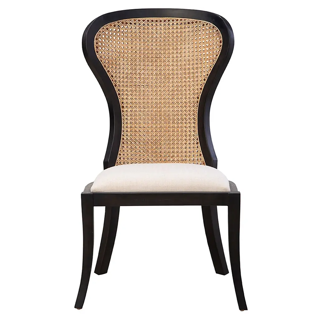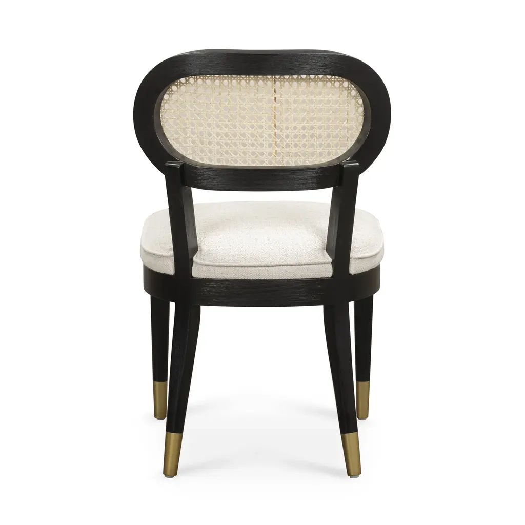 The Cosette Dining Chair is back with a bold twist. Crafted in sleek black wood and paired with a performance cream upholstered seat, it brings modern contrast to timeless mid-century lines. With its sculpted proportions, stunning cane back, and brass-capped legs, Cosette blends comfort and sophistication into a piece that feels fresh, refined, and forever stylish.