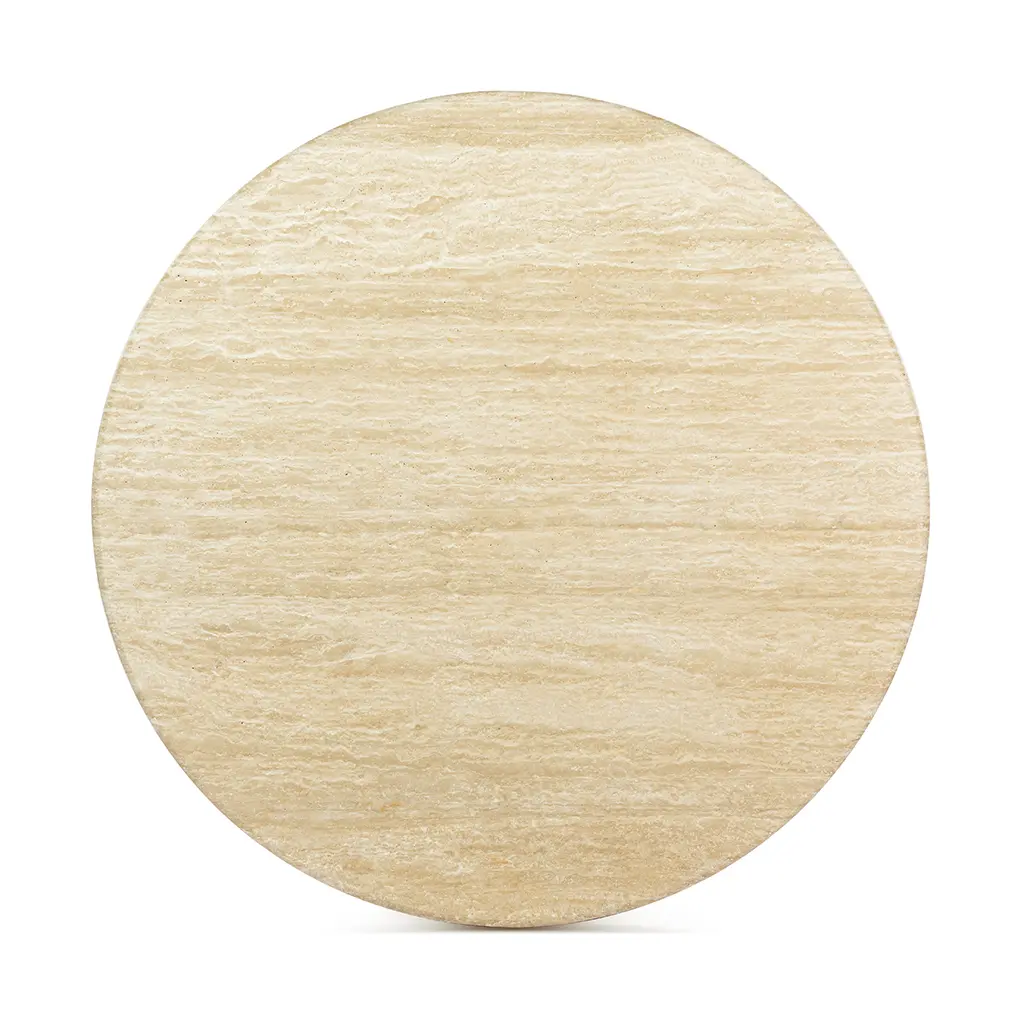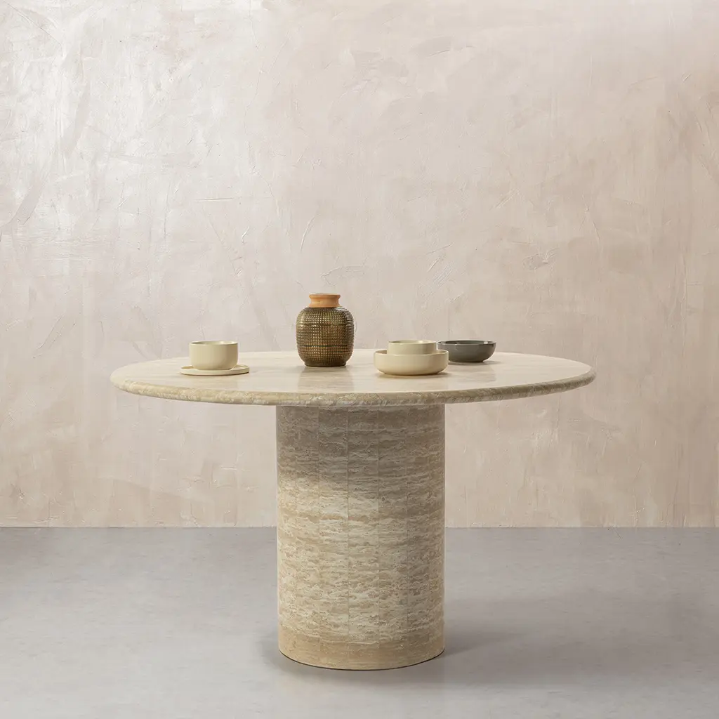 Simplicity in its greatest form. The Cosette Round Travertine Dining Table with Cylinder Pedestal Base presents a minimalist, streamlined silhouette that allows the travertine stone's organic variations in tone and texture to take center stage, while radiating elegance and grace.