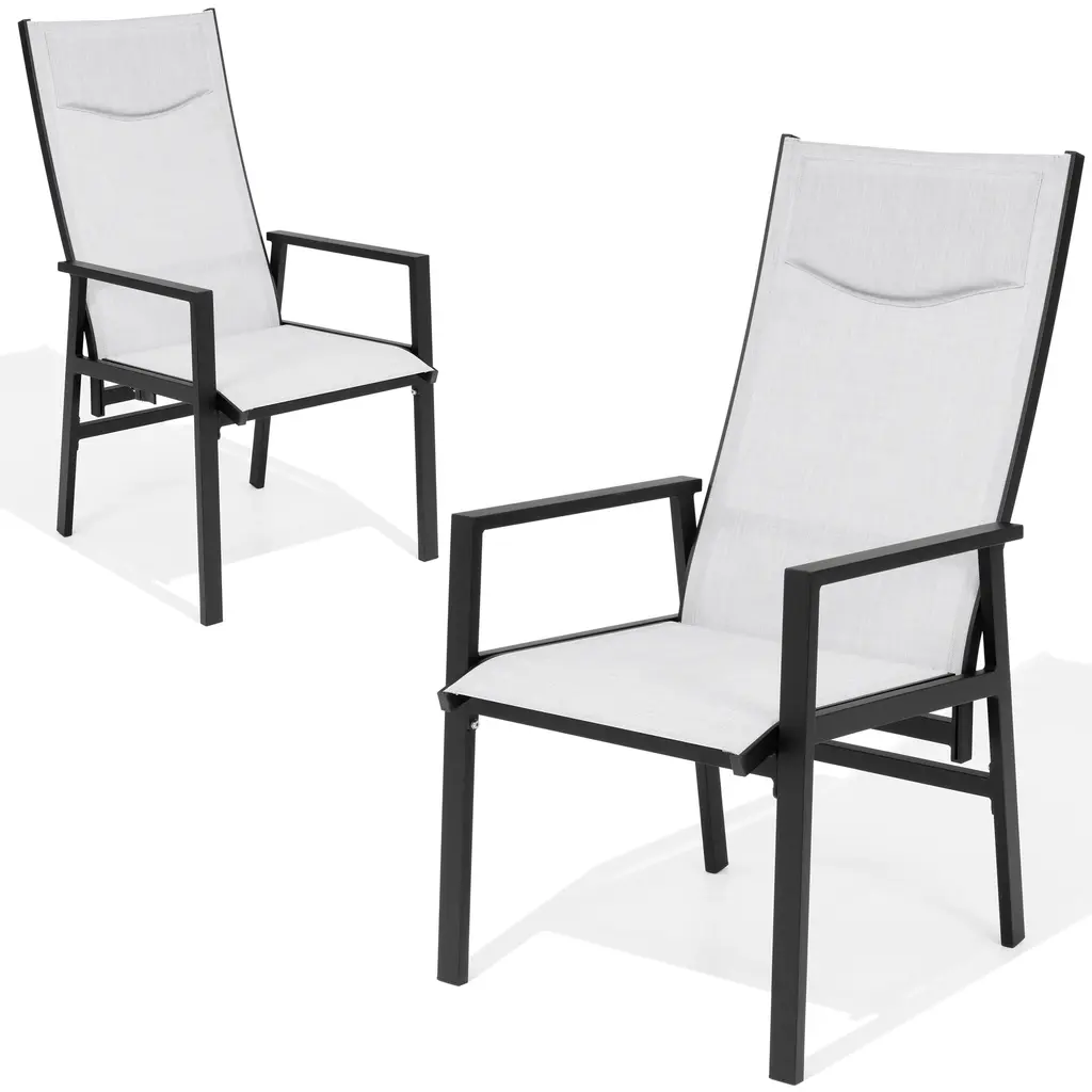These patio stacking chairs will be a great addition to any outdoor place! If you choose these outdoor dining chairs, they will bring you optimal comfort because of the breathable fabric, incline backrests, cozy armrests and wide seats. Moreover, the perfect seat height from the ground (16.5'') makes these patio chairs serve as outdoor dining chairs perfectly. When you sit on the armchair, the wear-resistant fabric and heavy-duty steel frame ensure long service time and strong stability. If you need to store them, just stack these armchairs together, greatly reducing storage space. FeatureStackable design for space-saving Lightweight structure for easy movement Fit your body curve perfectly with incline backrest and wide seat Ergonomic armrest for arm relaxation High-quality fabric for breathability and fast drying Hold up to 330 lbs for each chair by the sturdy and anti-rust steel frame Non-slip foot pads for extra stability and floor protection Easy to match the outdoor dining table (not included) due to 16.5'' perfect seat height from the ground Convenient to assembleSpecificationColor of Fabric: Black Color of Frame: Grey Material: Fabric, Steel Overall Dimension of Each Chair: 29'' x 21.5'' x 35.5'' (L x W x H) Seat Height from the Ground: 16.5'' Net Weight of Each Chair: 9 lbs Weight Capacity of Each Chair: 330 lbs Package Includes: 4 x Chairs 1 x Instruction