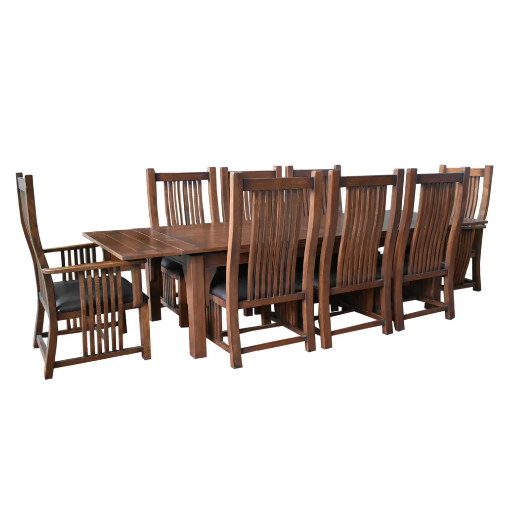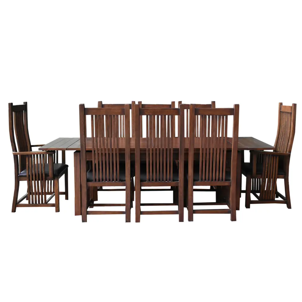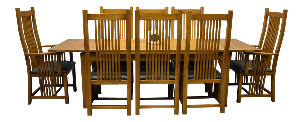 Our Mission / Arts & Crafts style furniture is made with attention to detail and expertise like that of 100 year old Stickley. This is a new, never used piece Solid oak and quarter sawn white oak with lacquer finish Walnut stain, medium-dark brown Pull out leaves on either end, self store underneath Set includes dining table, 2 arm chairs, 6 side chairs Sturdy traditional Mission style dining chairs Comfortable and durable leather on dining chair seat Dimensions: Dining Table Dimensions: 76 x 35.25 x 30.5 (98" with 2 leaves) Side Chair Dimensions: 19 x 19 x 48 Arm Chair Dimensions: 26 x 19 x 48 Free Shipping: We do our best to have your item delivered within 2 - 3 weeks. More rural or hard to reach areas can take up to 5 weeks. The shipper will only move the item through the front door of your home or building.