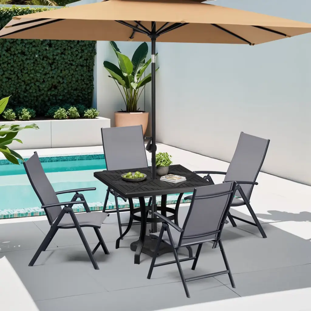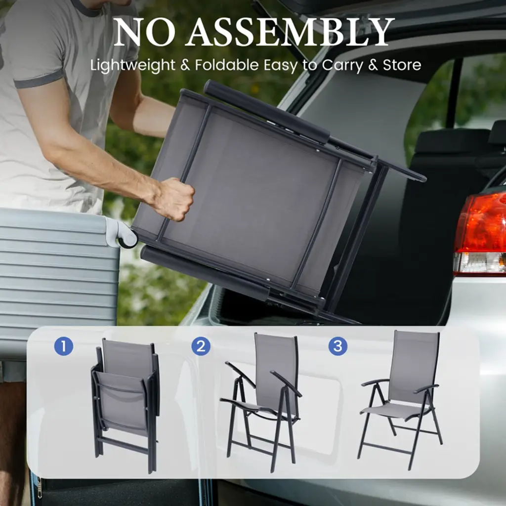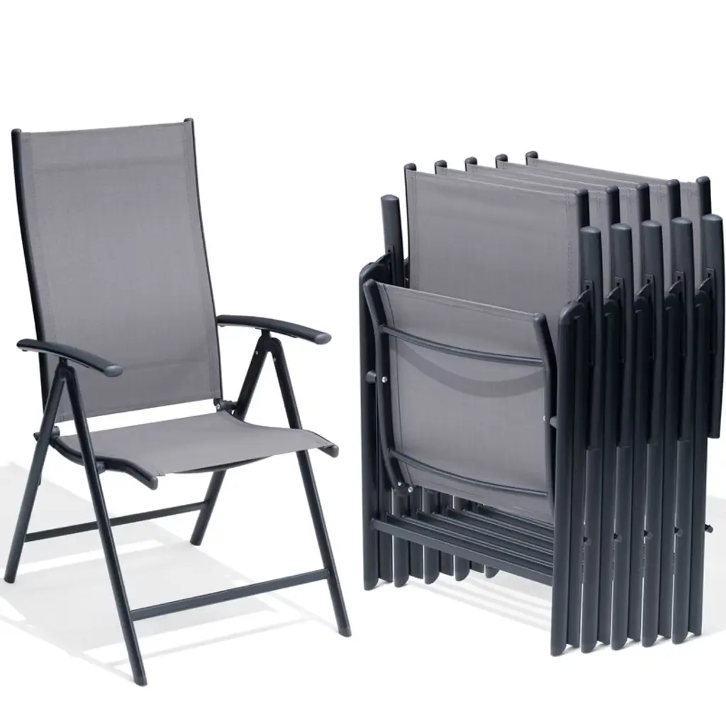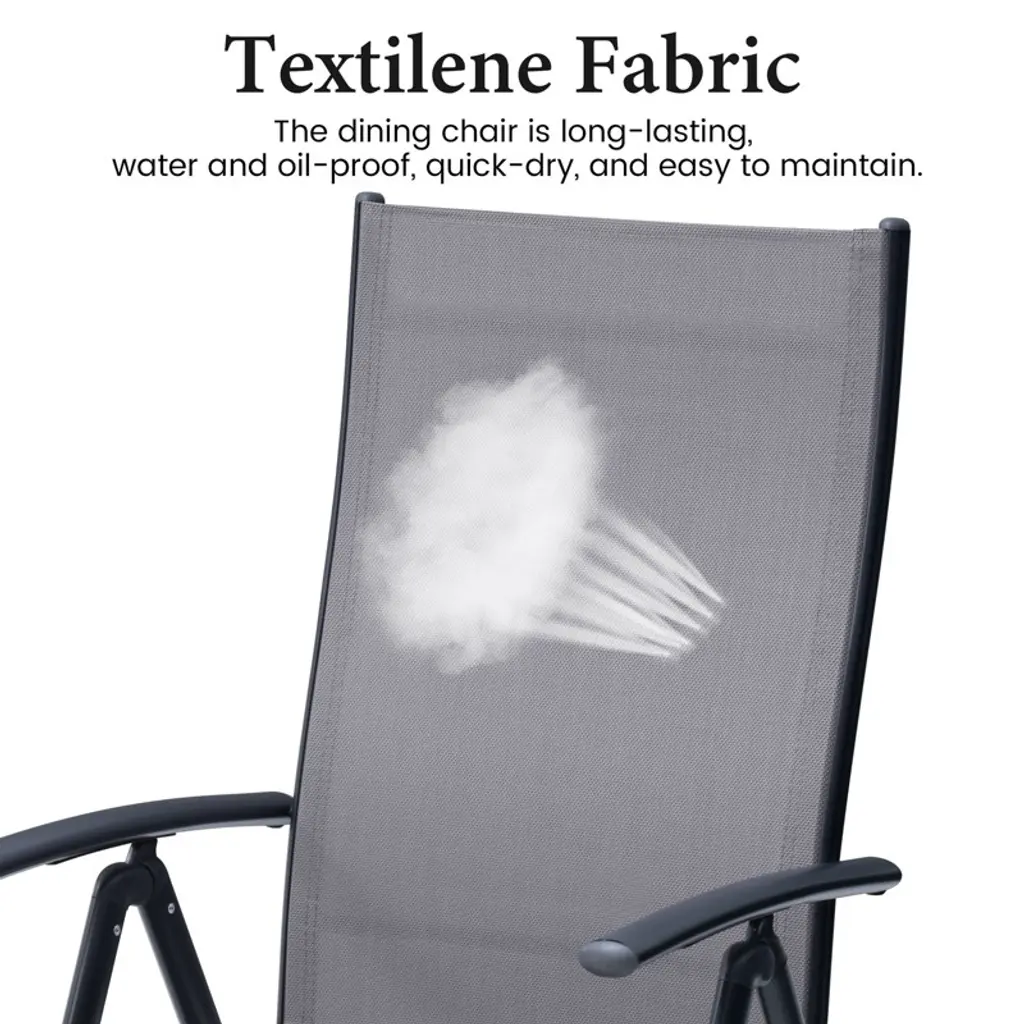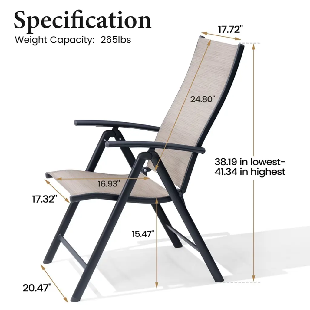 Our iron dining chairs are equipped with armrests and supportive backrests to enhance your outdoor dining experience and meet your outdoor dining needs. The chairs are foldable and require no assembly, making them easy to carry and move. The chairs have a load capacity of 265 pounds. The backrest has seven levels of adjustment to best meet your needs. Perfect for the garden, patio, deck, yard or balcony. Seat dimensions: 17.32 inches wide x 16.93 inches deep Seat height: 15.47 inches high Backrest dimensions: 17.72 inches wide x 24.8 inches high
