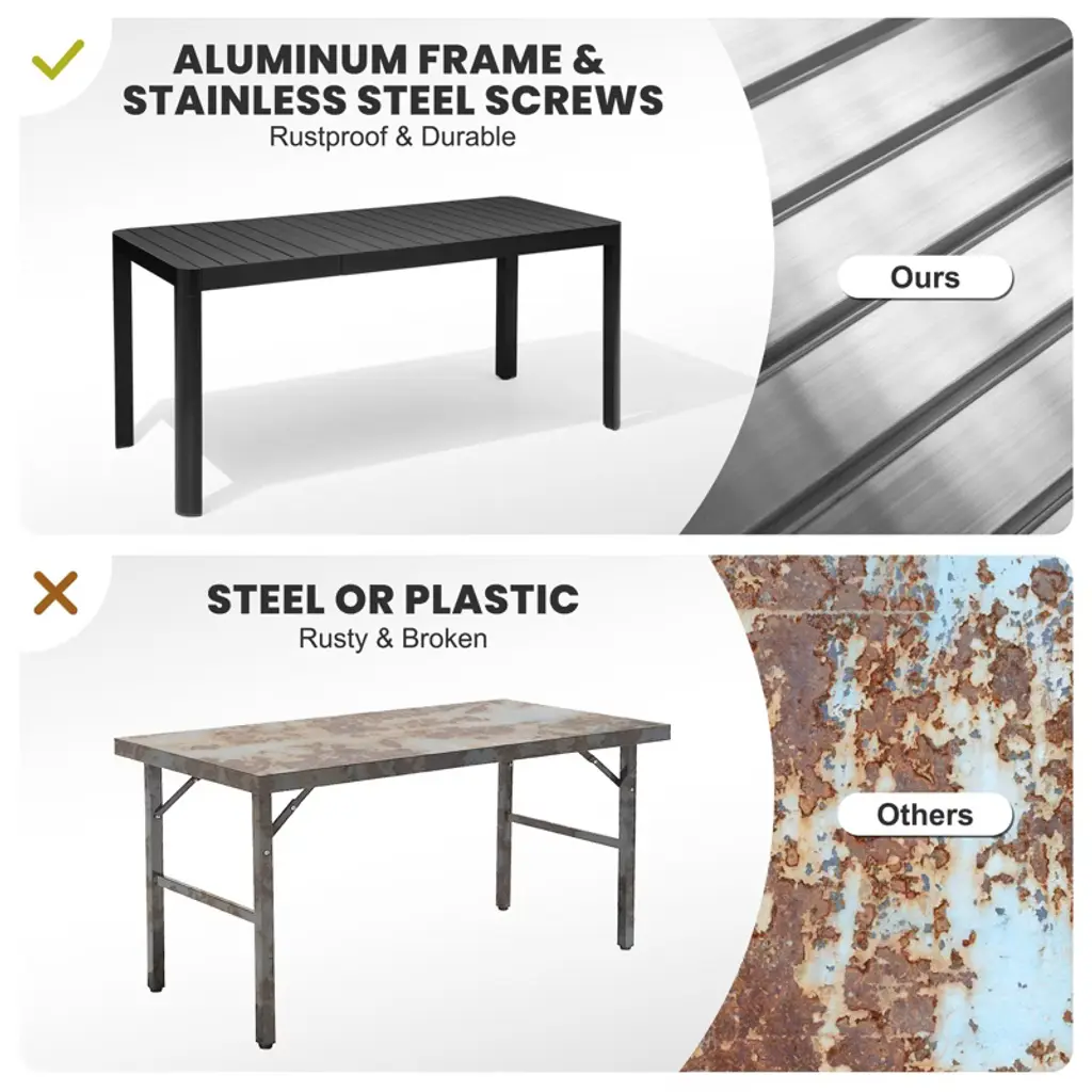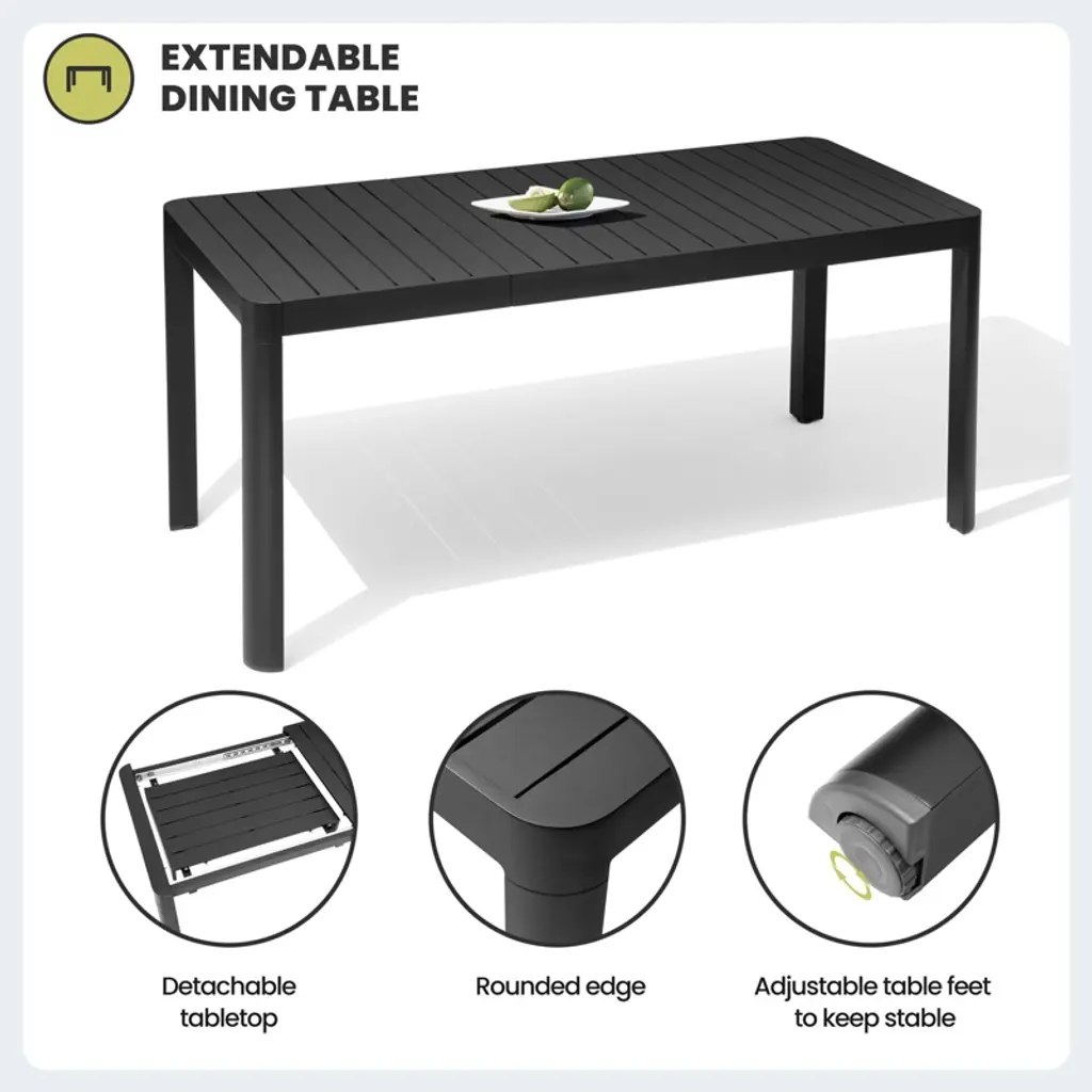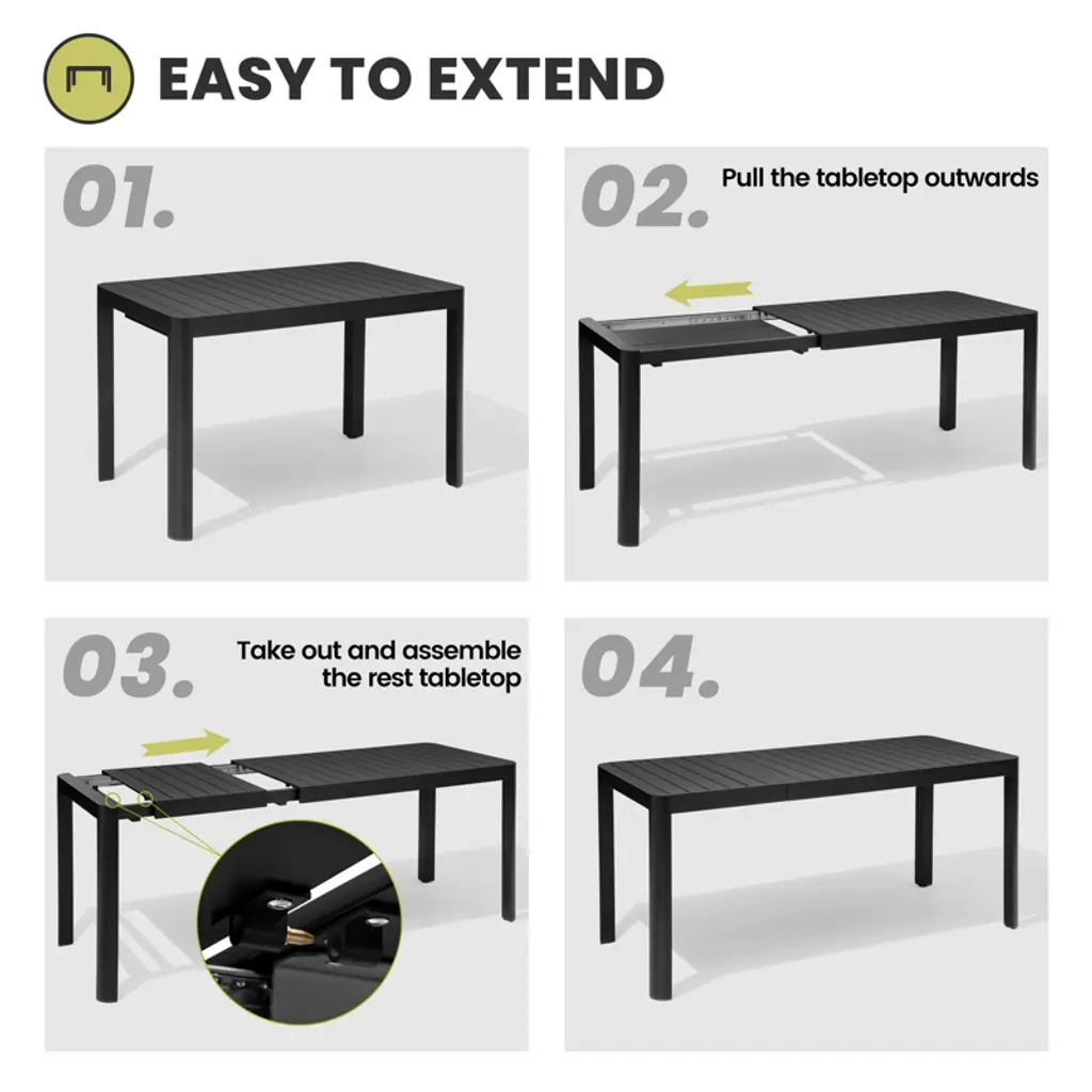 Take meals outside with this chic, durable patio dining set. The aluminum structure and slatted design not only offers a refined, minimalistic look but also provides a stable structure. this table includes the hidden tabletop to expand the width and accommodate extra guests. With clean, straight lines, this table is the ideal modern accessory for your outdoor space.