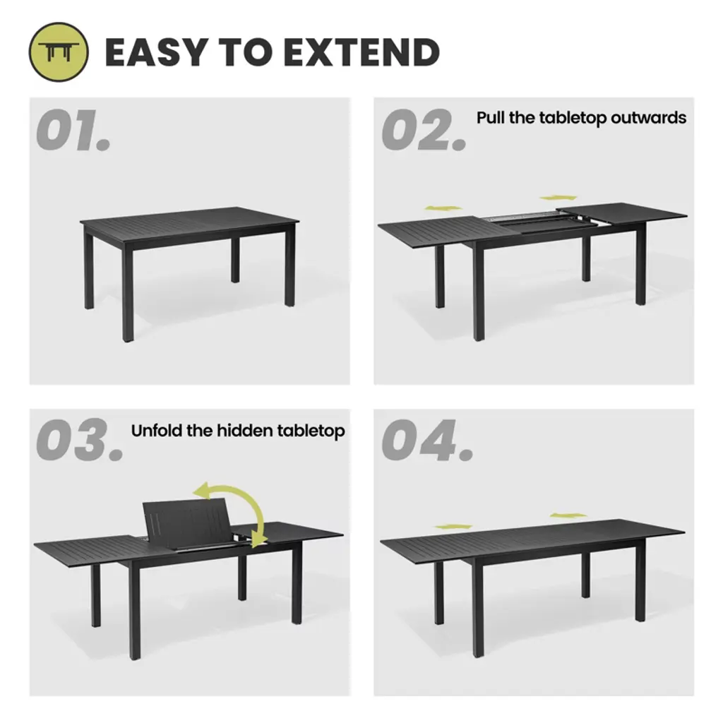 Upgrade your outdoor dining area with our Expandable Aluminum Dining Set that comfortably seats 6-8 people. Crafted from high-quality aluminum, this table is built to last and withstand harsh outdoor conditions. The expandable design makes it easy to adjust the size according to your needs, providing a versatile option for any occasion. Whether you're hosting a family dinner or having a barbecue with friends, this table will provide ample space for everyone to enjoy their meal. Don't settle for a cramped and uncomfortable dining area, choose our Expandable Aluminum Table for an elevated outdoor experience!