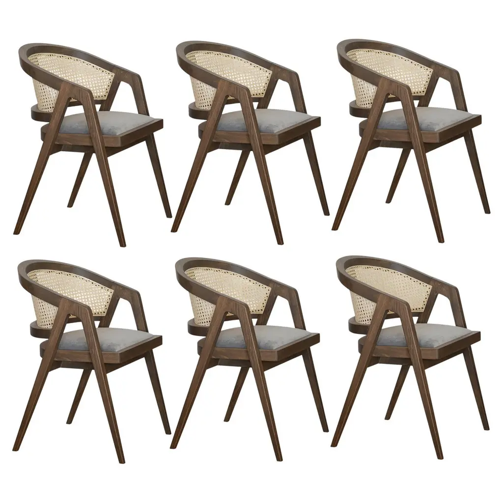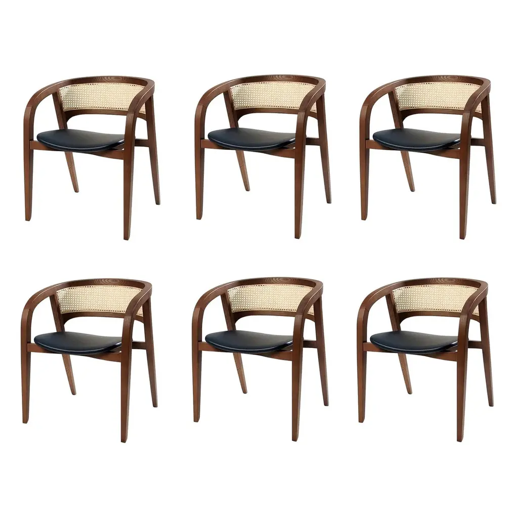 Handcrafted dining chair with a mid-century design that stands out for its modern silhouette. Dark stained 134.A3 color frame with natural cane curved backrest, and black faux leather, stainless steel caps are optional.Available in other wood and upholstery finishes upon request.COM available upon request.Contact us to enquire about COM/COL production, requirements and material shipping instructions.Please contact us if you have any questions about customization and pricing. We will be glad to check with the factory’s technical team if sizes, finishes, and colors can be customized. We do our best to expedite production and to ship and deliver product within the listed lead time, however current lead times might be longer due to global shipping backlog and delays. These delays are out of our control and cannot be a reason to cancel an order.