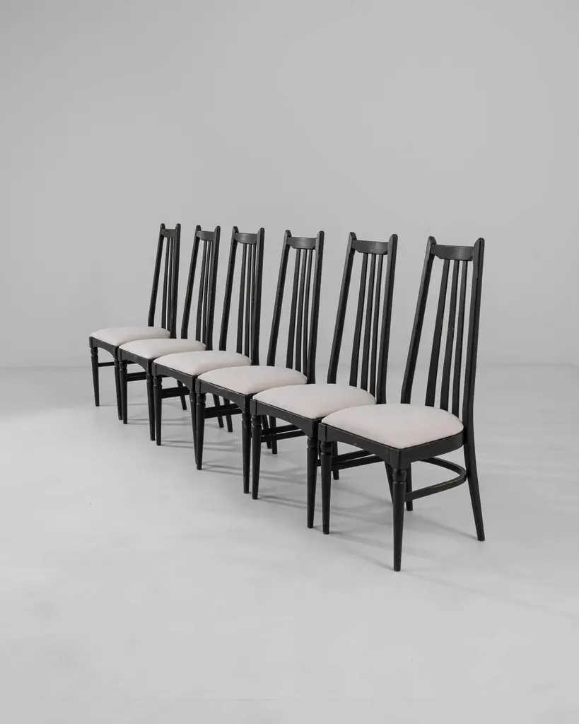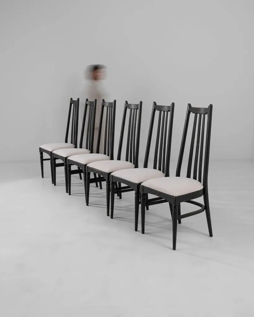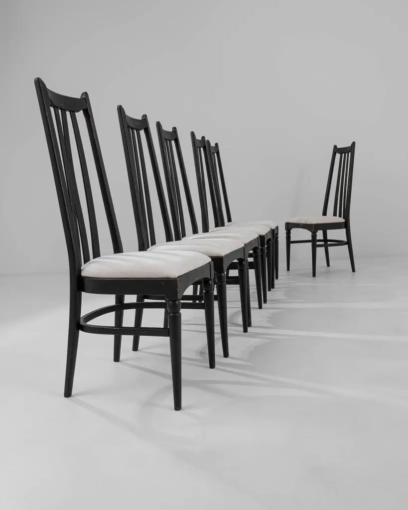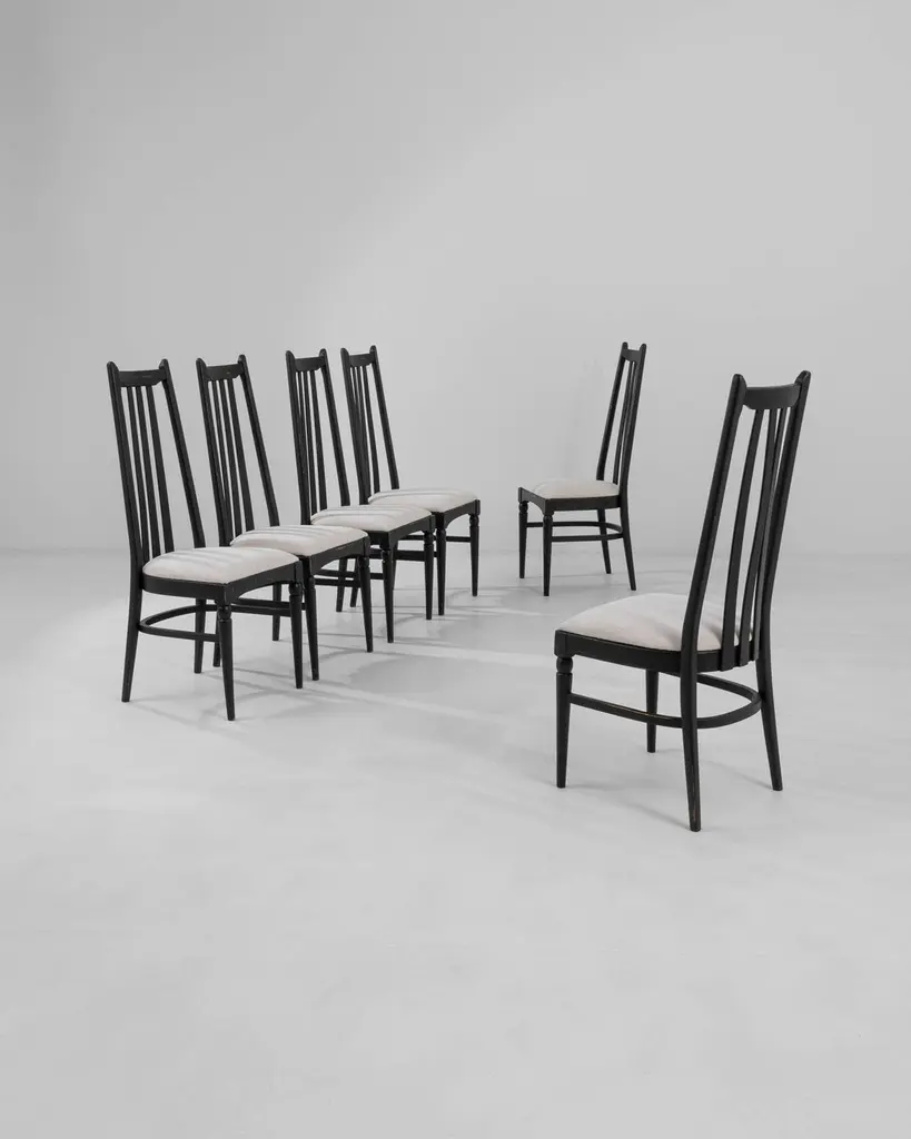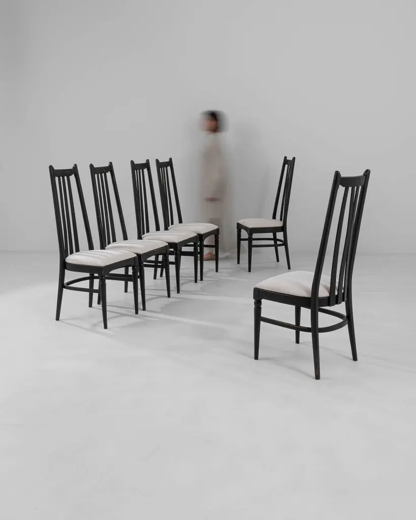 This set of six dining chairs, produced circa 1960 in Czechia, exudes a hint of gothic allure combined with mid-century modern style. The tall black backs, topped with minimalist finials resembling ears, and the sleek tapered legs, adorned with simple baluster elements, evoke a nostalgic charm reminiscent of noir films. Upholstered in soft white fabric, these chairs effortlessly strike a perfect balance between elegance and comfort, making them an exquisite addition to a tasteful home.