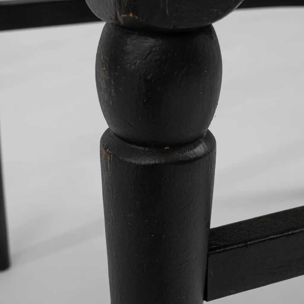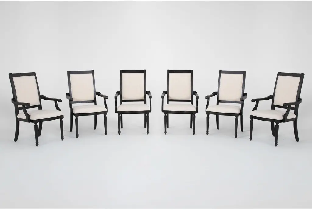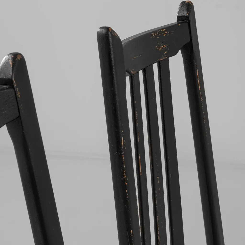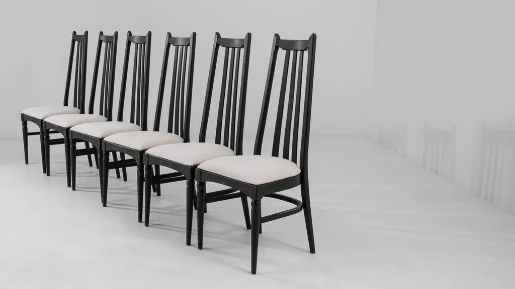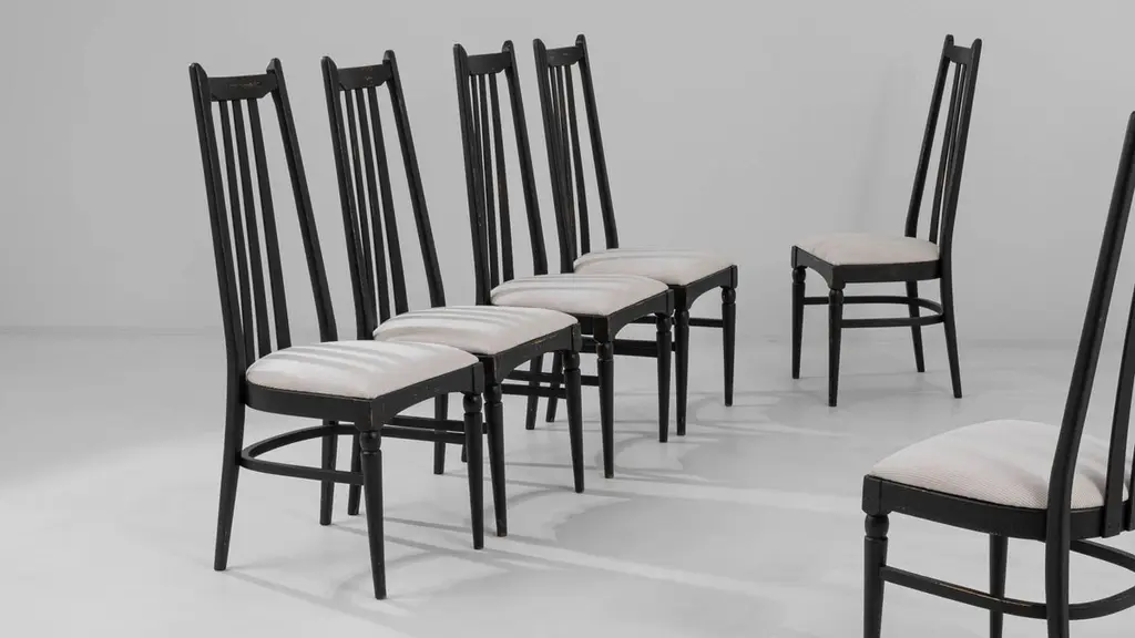 This set of six dining chairs, produced circa 1960 in Czechia, exudes a hint of gothic allure combined with mid-century modern style. The tall black backs, topped with minimalist finials resembling ears, and the sleek tapered legs, adorned with simple baluster elements, evoke a nostalgic charm reminiscent of noir films. Upholstered in soft white fabric, these chairs effortlessly strike a perfect balance between elegance and comfort, making them an exquisite addition to a tasteful home.