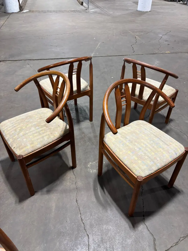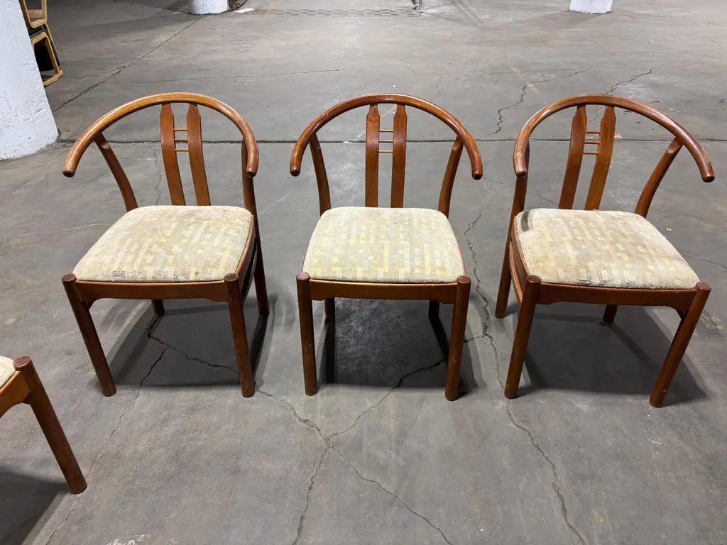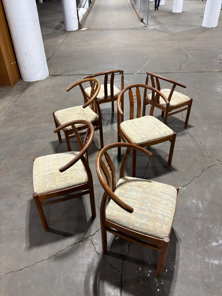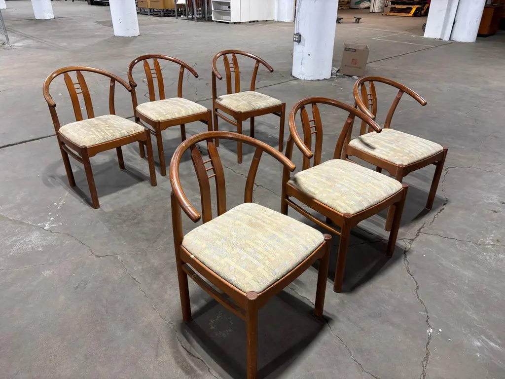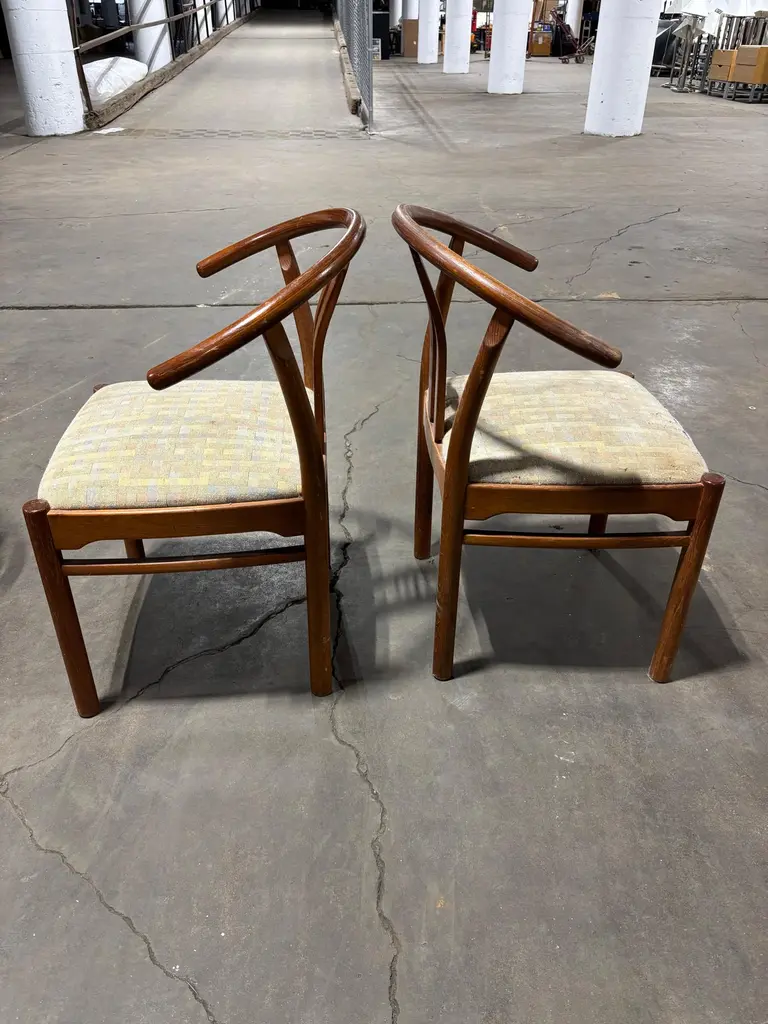 Set of Bentwood and Teak Dining Chairs. Chairs need to be reupholstered but wood is pretty nice. Set of 6 Chairs attributed to Hans Frydendal. Chairs also have a Hans Wegner Wishbone vibe. Nice size with an ample seat! We can have these reupholstered so please inquire!