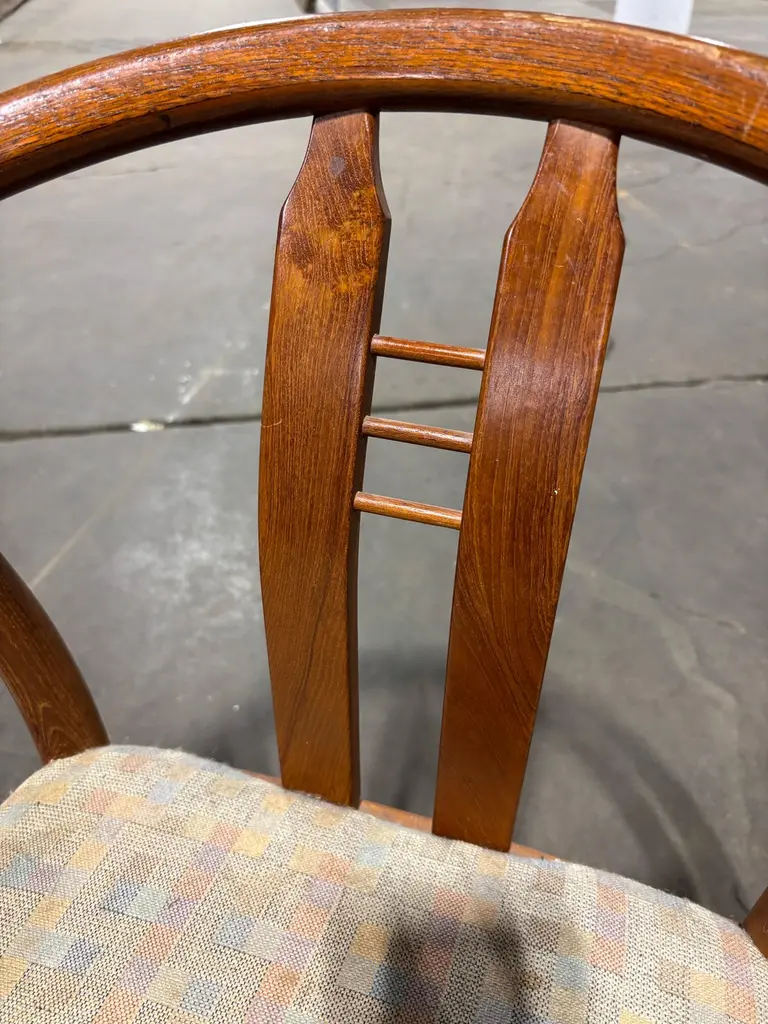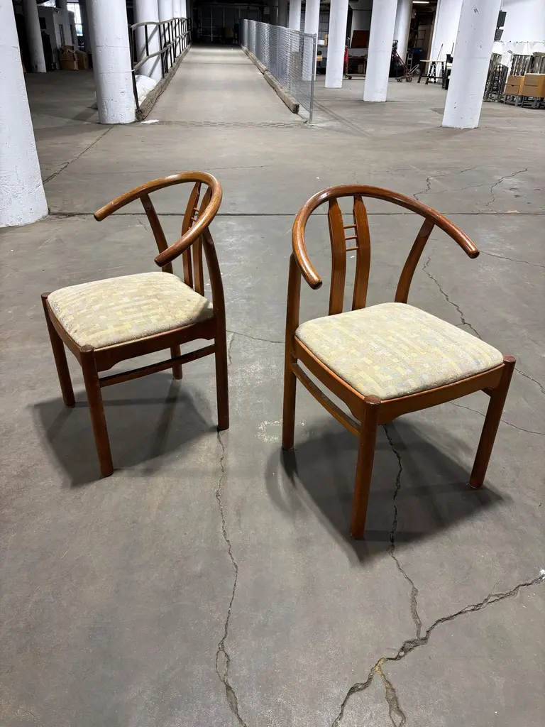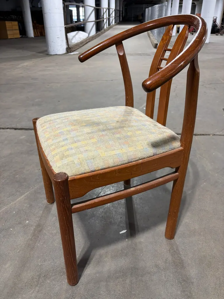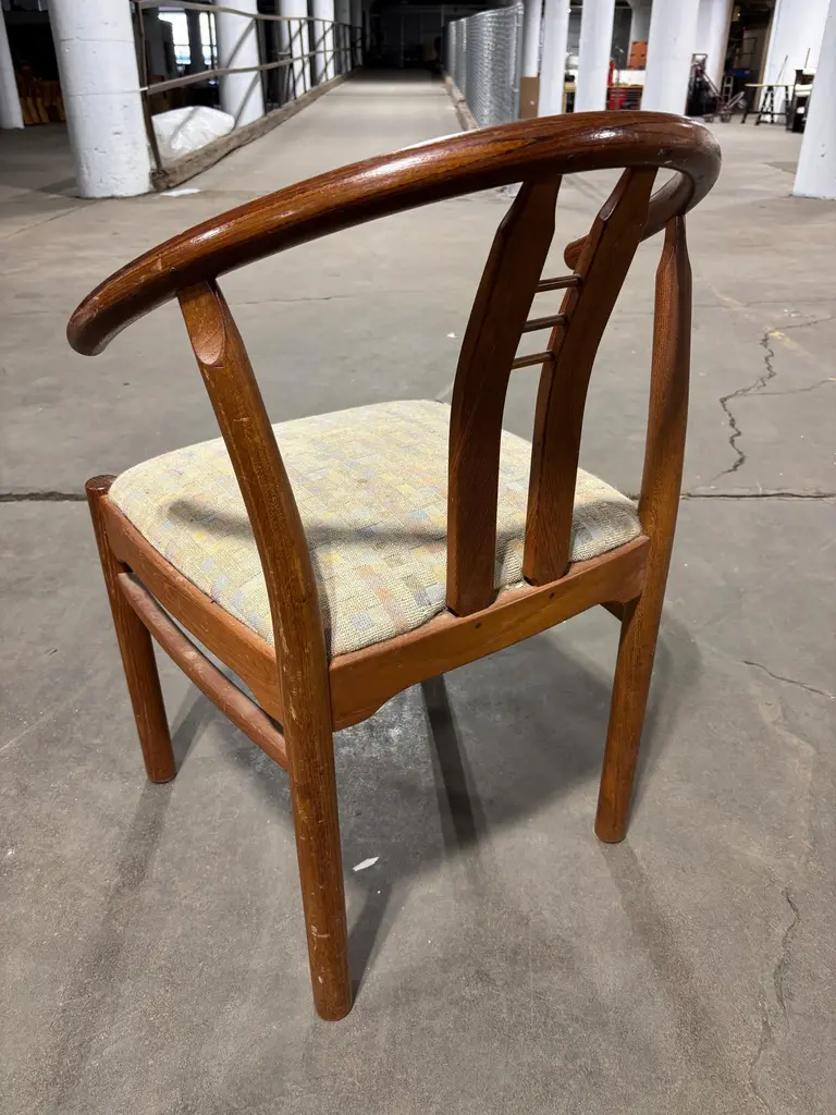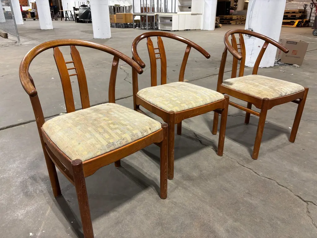 Set of Bentwood and Teak Dining Chairs. Chairs need to be reupholstered but wood is pretty nice. Set of 6 Chairs attributed to Hans Frydendal. Chairs also have a Hans Wegner Wishbone vibe. Nice size with an ample seat! We can have these reupholstered so please inquire!